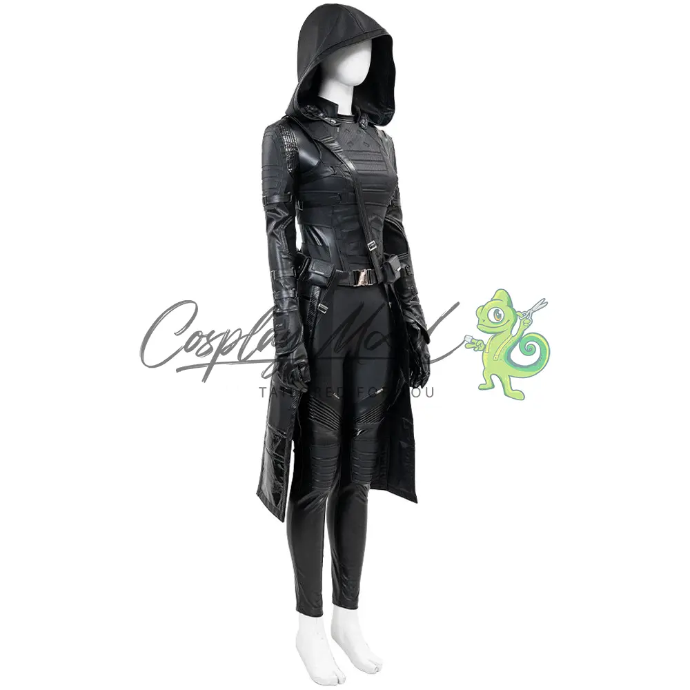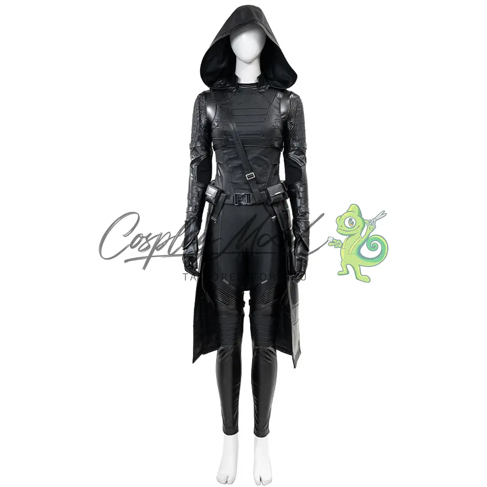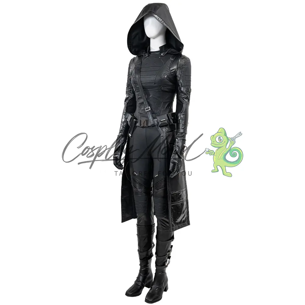 Tuta integrale nera, guanti, cappotto lungo con falda e cappuccio, gilet sempre nero, cintura e cintura per il petto, stivali in coordinato inclusi.