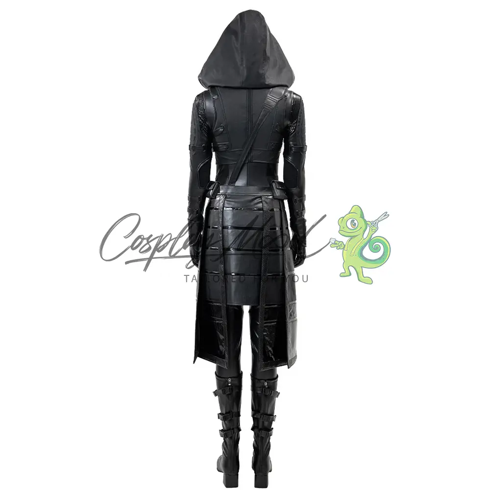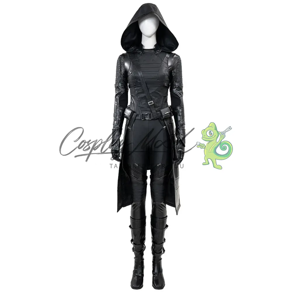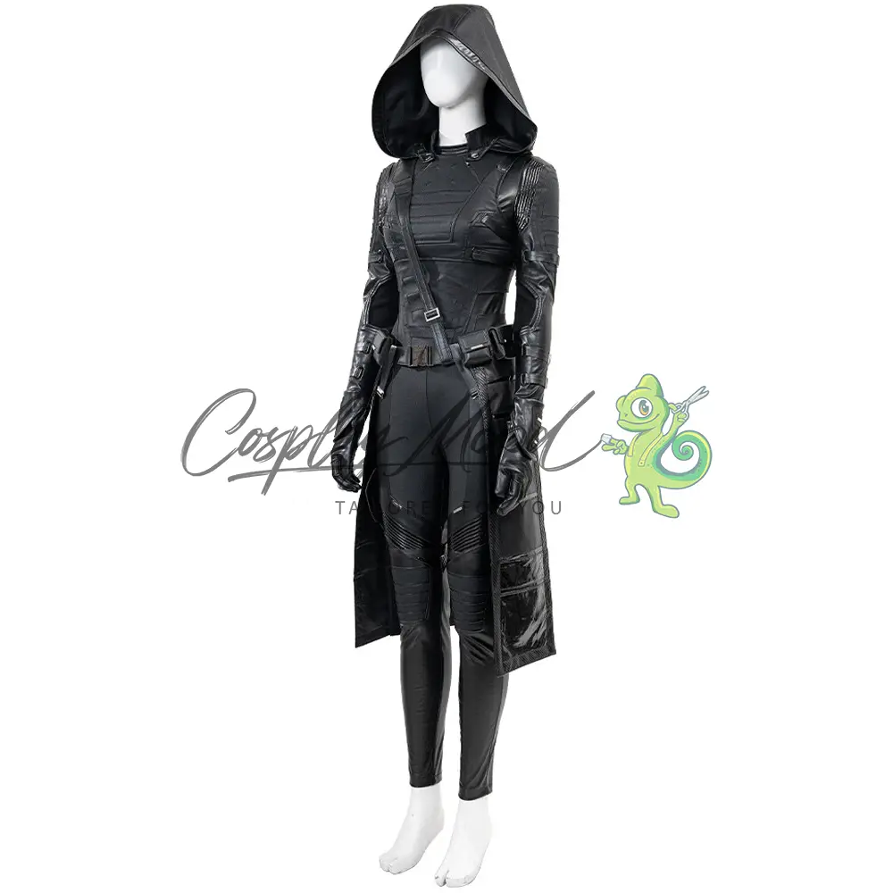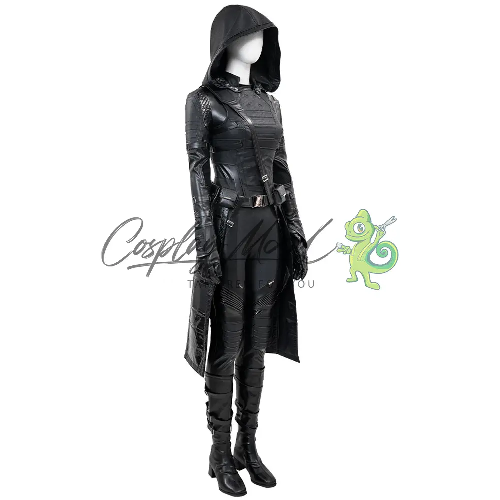 Tuta integrale nera, guanti, cappotto lungo con falda e cappuccio, gilet sempre nero, cintura e cintura per il petto, stivali in coordinato inclusi.
