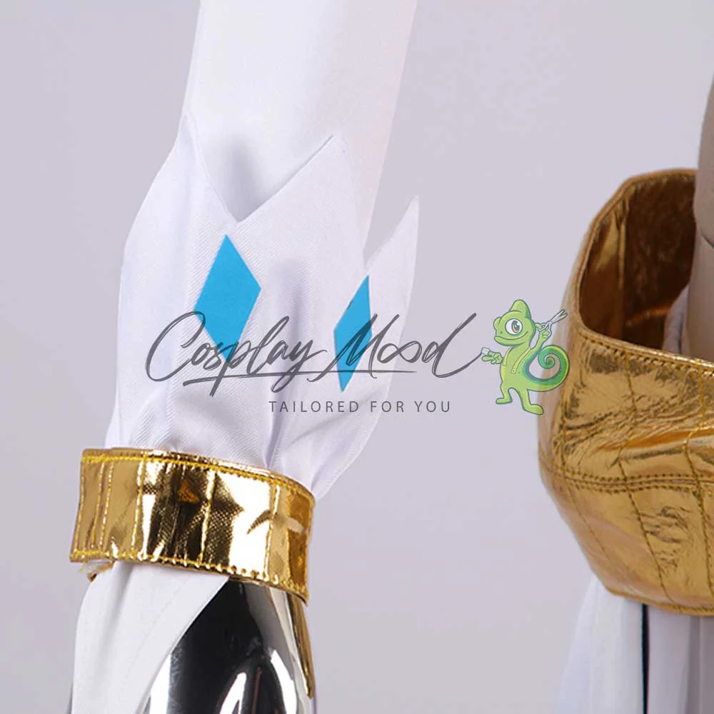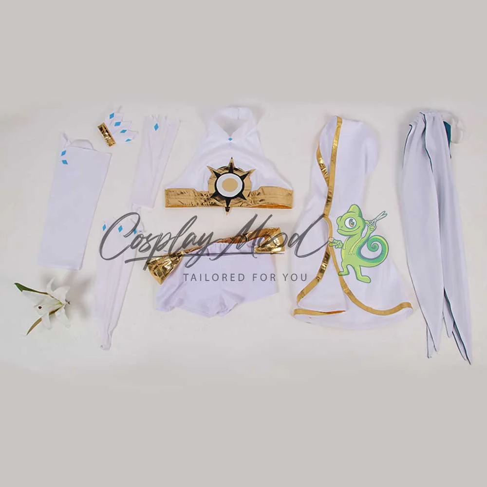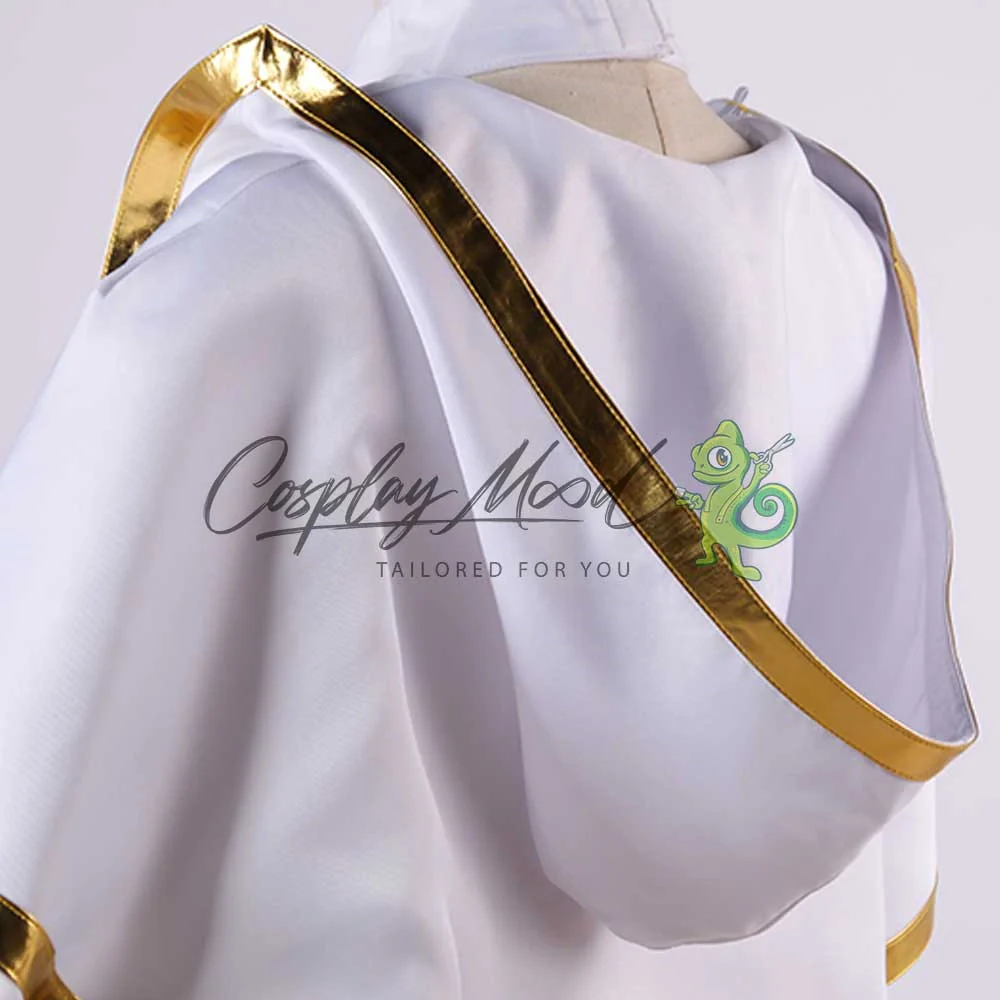 Top bianco e dorato con collo alto, pantaloncini con cintura dorata, giacca con cappuccio e bordo color oro, copri braccia, falda posteriore e fiocco per capelli a forma di fiore.