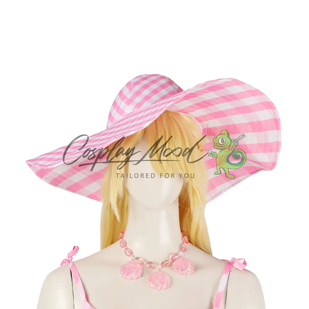 Abito rosa con quadretti bianchi, fiocco laterale e apertura a cuore sulla schiena, pantaloncini in coordinato, ampio cappello, collana con conchiglie rosa, bracciali e orecchini.