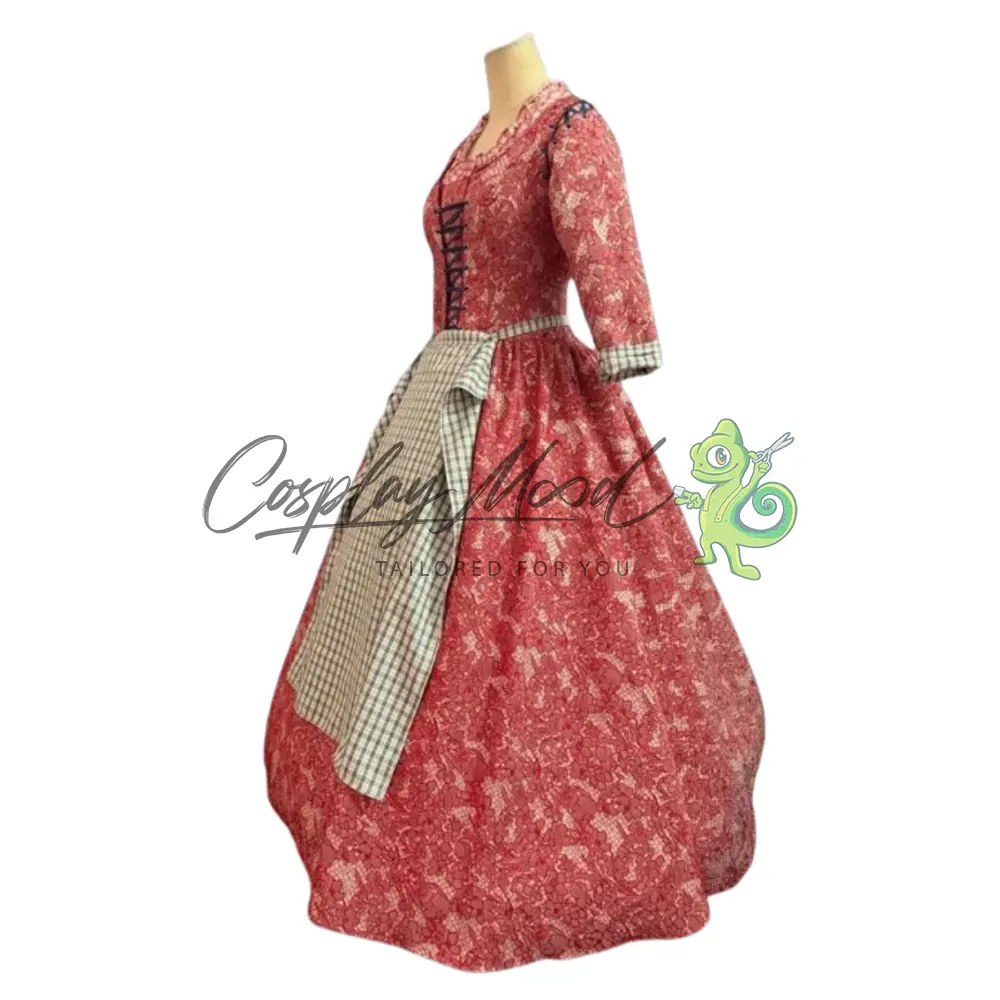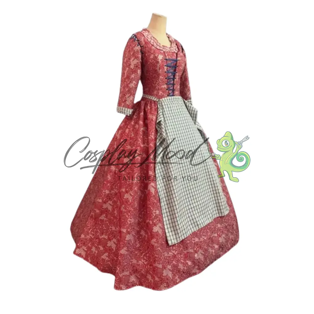 Vestito lungo rosso con texture a fiori, maniche lunghe con polsini bianchi e laccetti frontali neri, grembiule in coordinato.