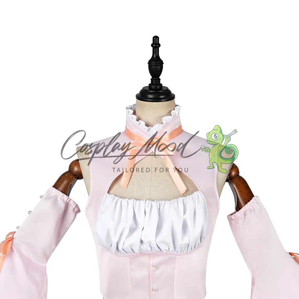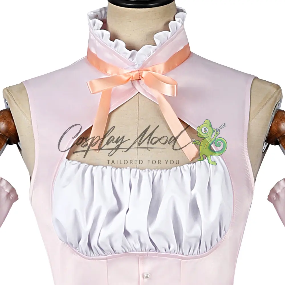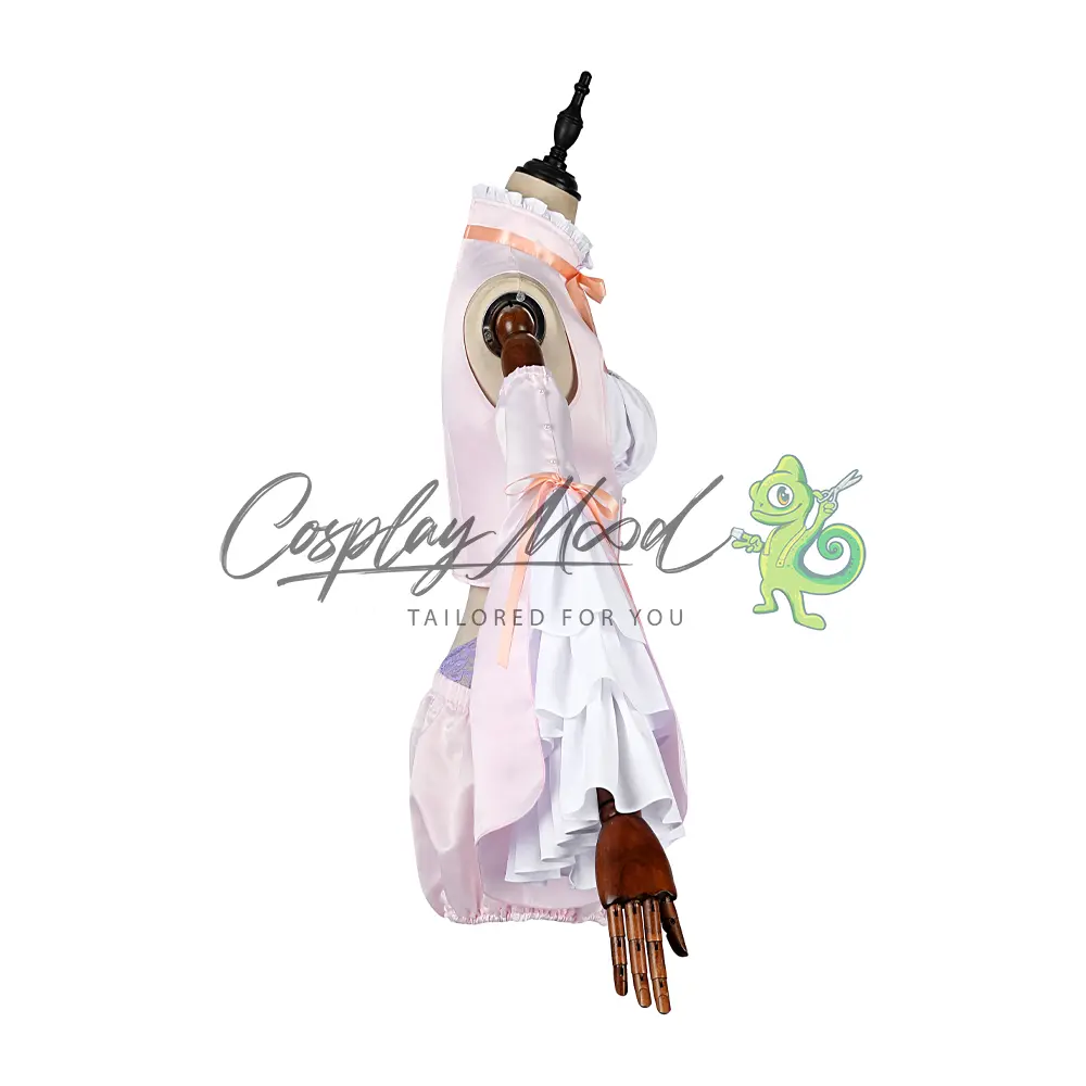 Vestito rosa e bianco con cinghie frontali e merletti all’altezza del collo, nastrino rosa e bottoncini bianchi, maniche lunghe ed ampie di colore rosa e bianco, sempre corredate da nastrino rosa e bottoncini, pantaloncini corti bombati con pizzo viola, calze lilla.
