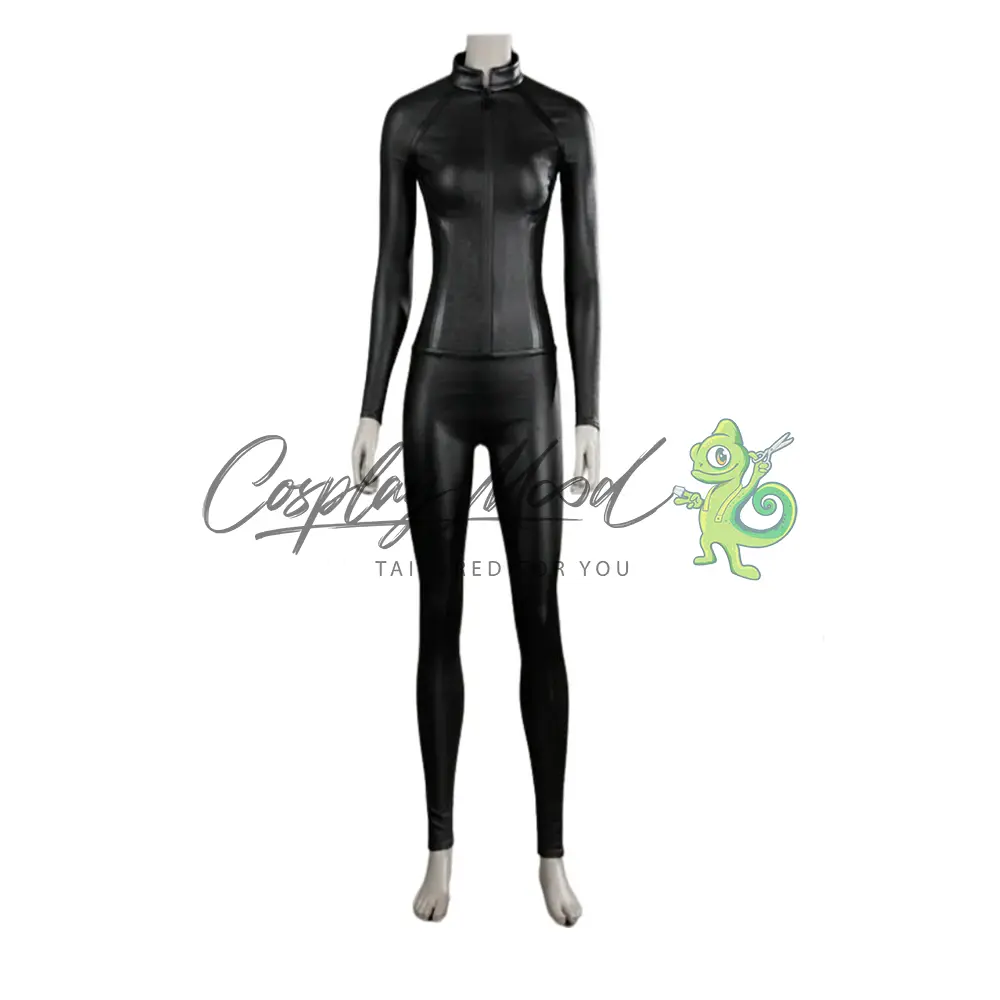Tuta in ecopelle nera aderente, cerniera frontale e dettagli in rilievo, riproducendo fedelmente il look tecnico e funzionale del film, guanti lunghi in ecopelle per un’autentica presenza da ladra di Gotham.