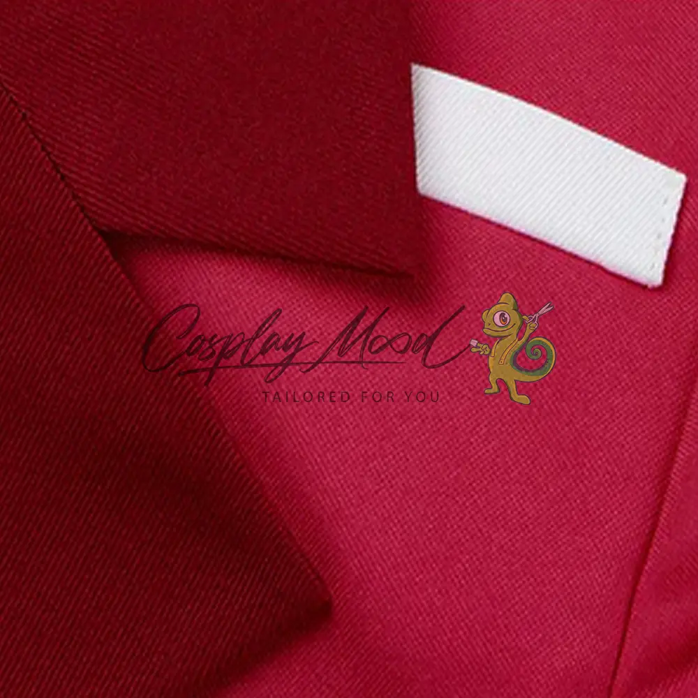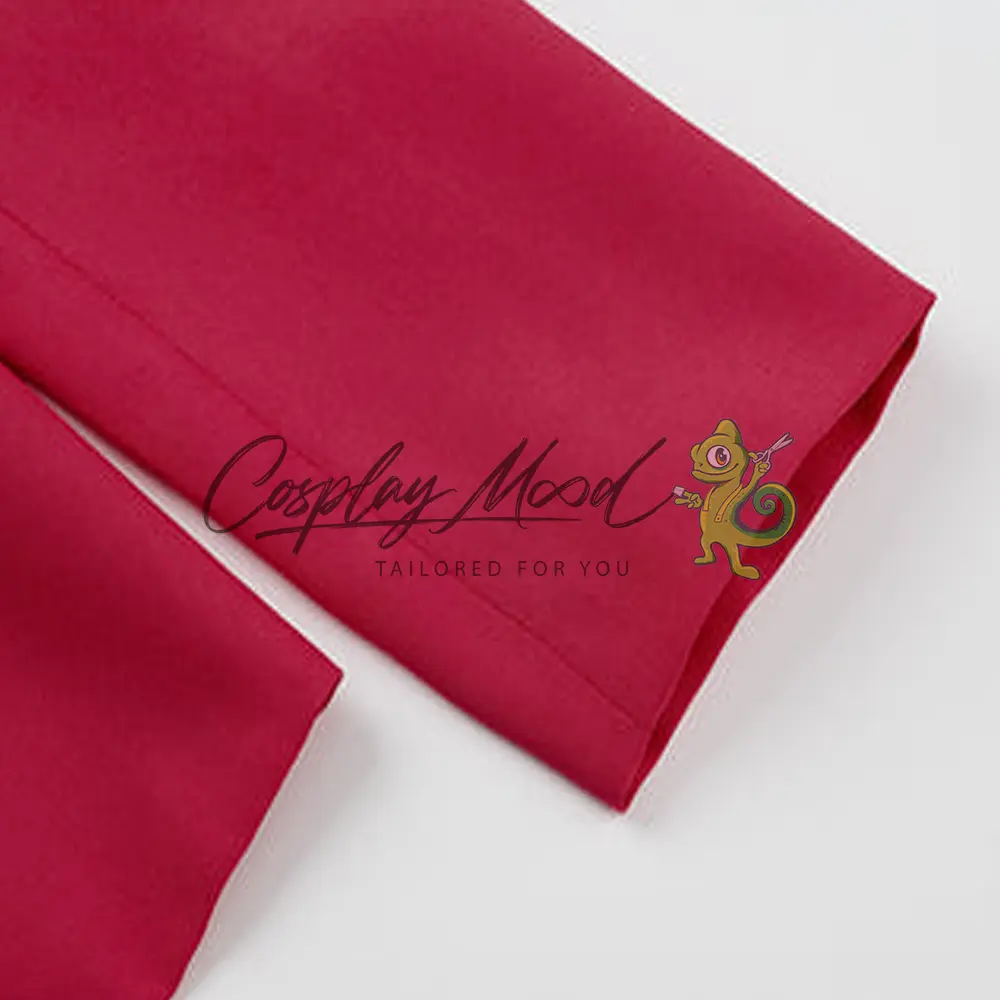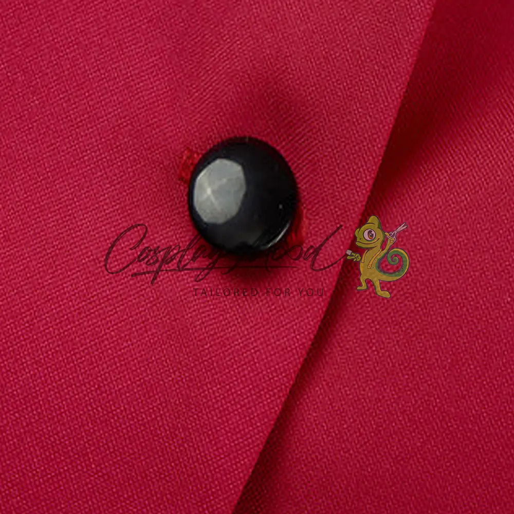 Giacca rossa con colletto e maniche rosso scuro, papillon nero, maglia bianca a collo alto bianca con bottoni neri, guanti bianchi con unghie finte, pantaloni lunghi rossi.