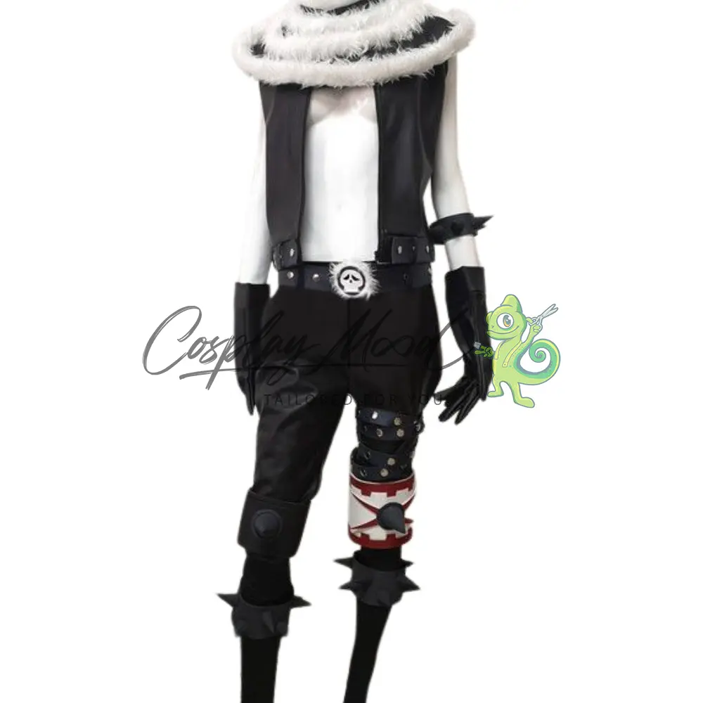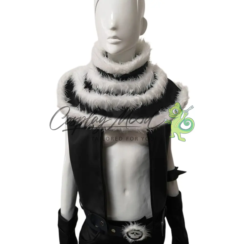Sciarpa ampia con colletto di pelliccia sintetica bianco e nero, il dettaglio più iconico del look di Katakuri, che esalta la sua imponenza, gilet nero senza maniche, uno stile minimalista ma aggressivo, lasciando scoperte le braccia per mettere in risalto i muscoli e le fasce da combattimento.
