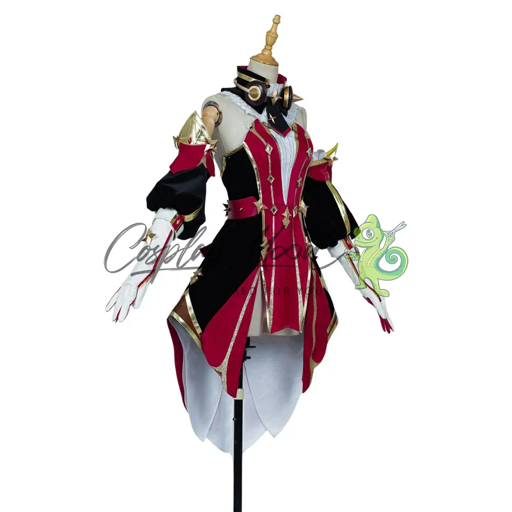 Cappello, prop delle cuffie da appendere al collo, costume corto, calze lunghe con decorazioni rigide, visione di pyro, benda per l’occhio, guanti lunghi, manicotti e decorazioni varie. Scarpe vendibili separatamente e disponibili su richiesta.
