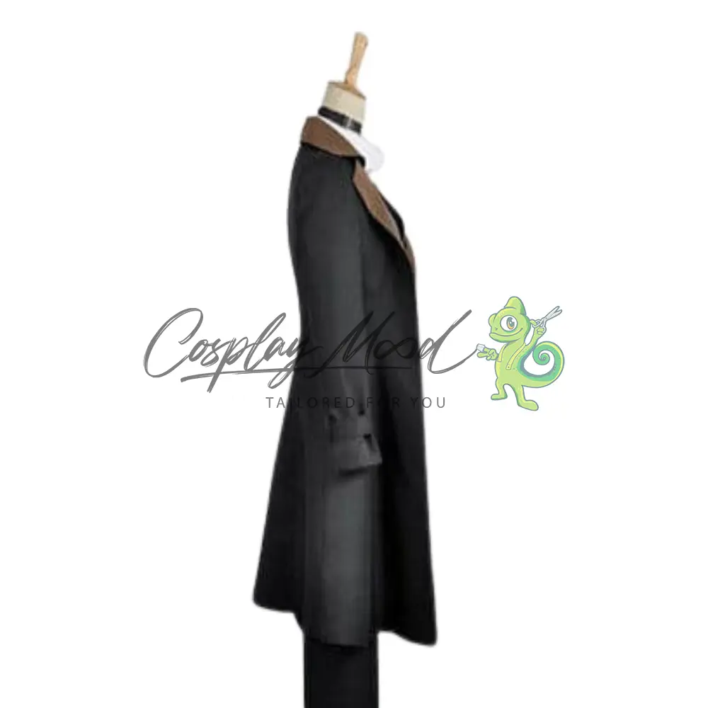 Cappotto lungo nero con bavero marrone, un elemento distintivo che esalta il suo stile raffinato e misterioso, gilet grigio con camicia bianca, classico look formale, perfettamente in linea con la sua personalità. Pantaloni neri slim-fit, eleganti e aderenti, completano il suo outfit da mafioso.