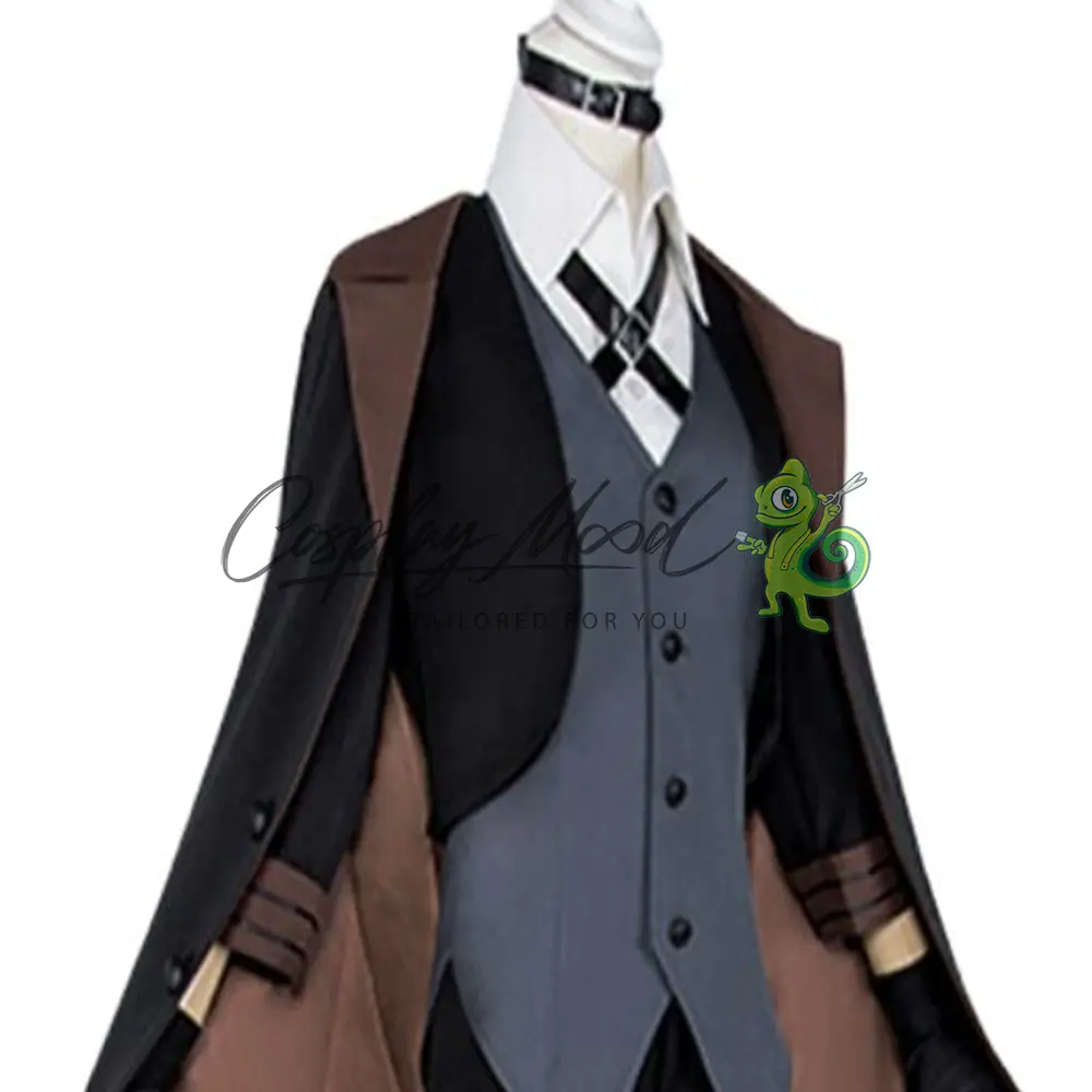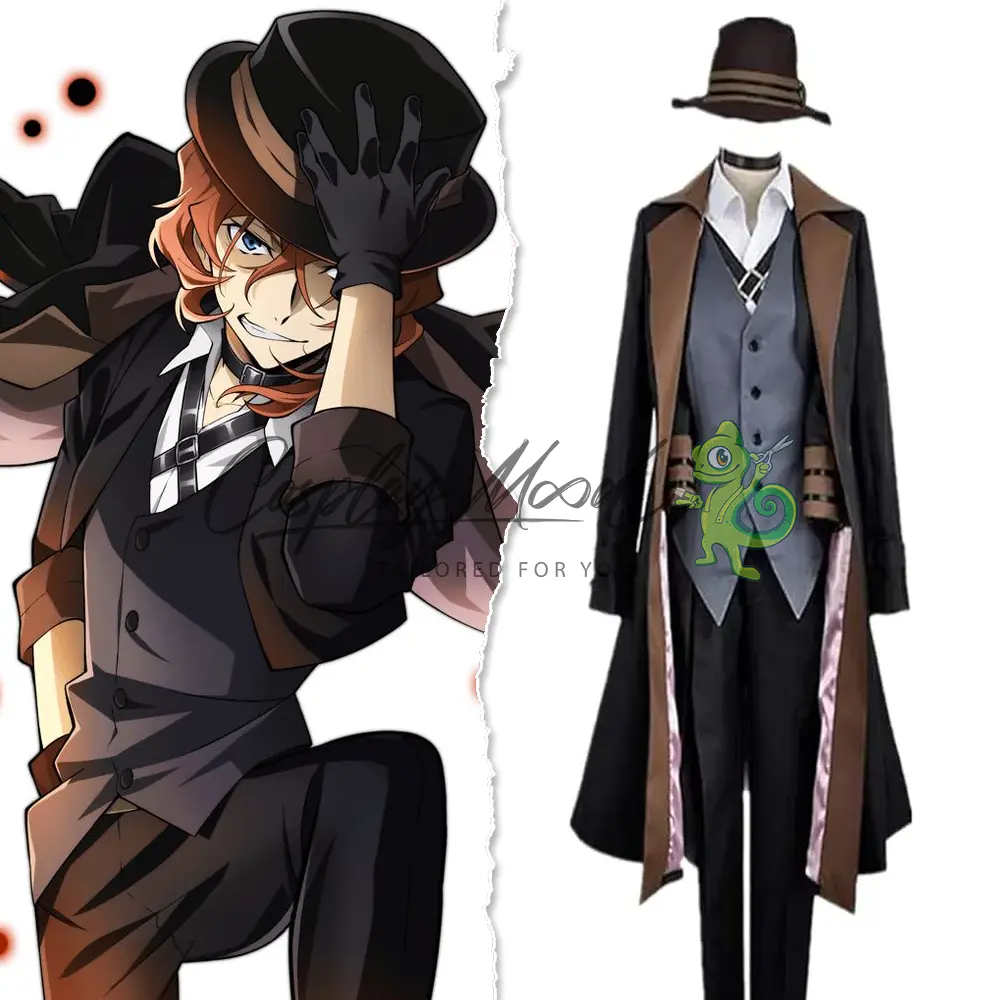 Cravatta nera e accessori vari, dettagli che enfatizzano il suo aspetto sofisticato e letale, completa un cappello a tesa larga con fascia marrone, il simbolo più riconoscibile di Chuuya, che aggiunge un tocco di classe e mistero.
