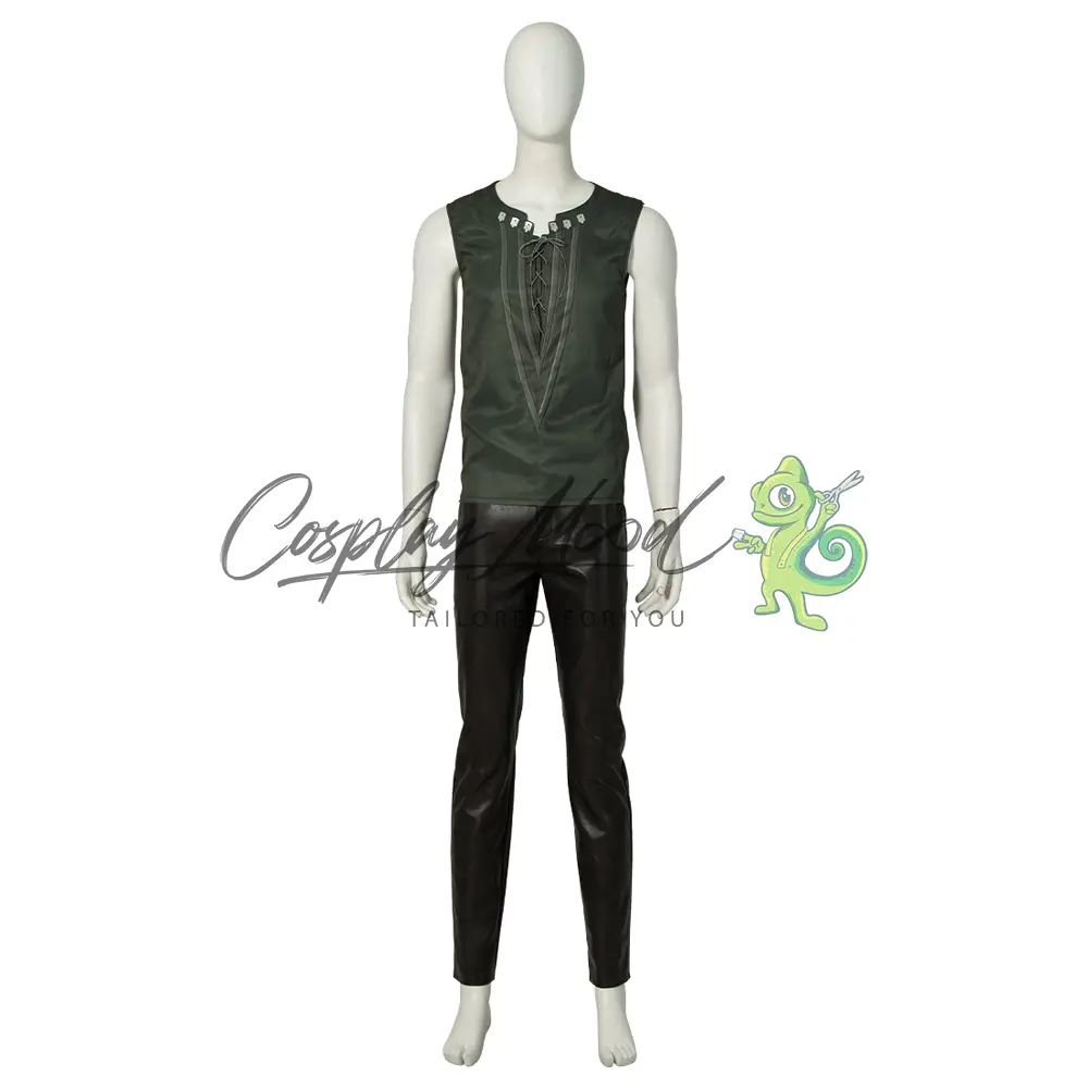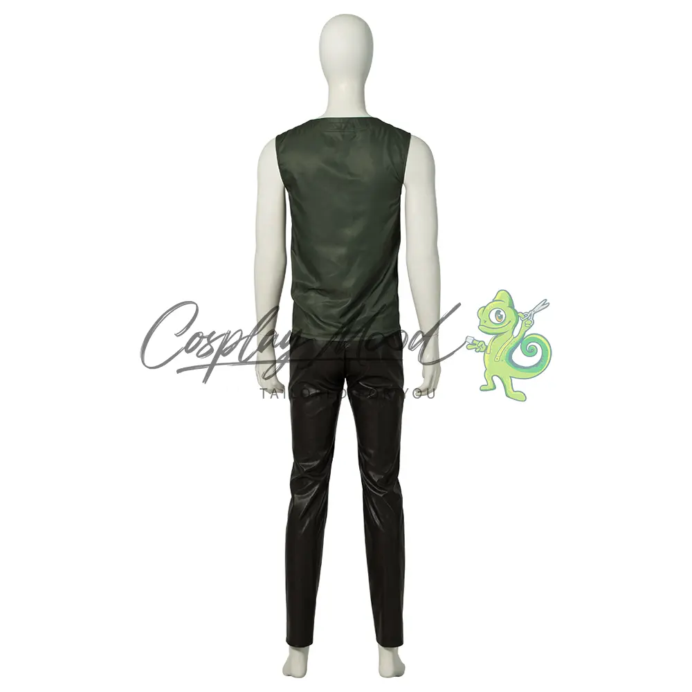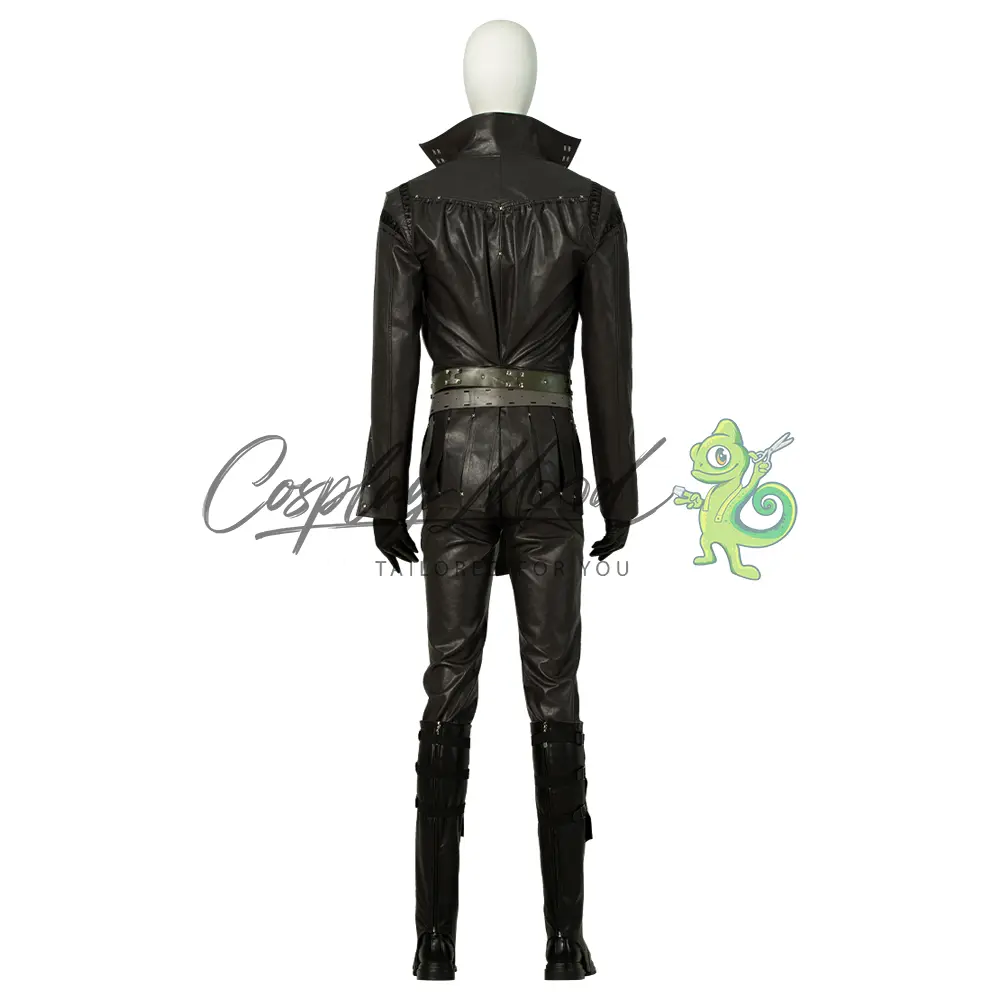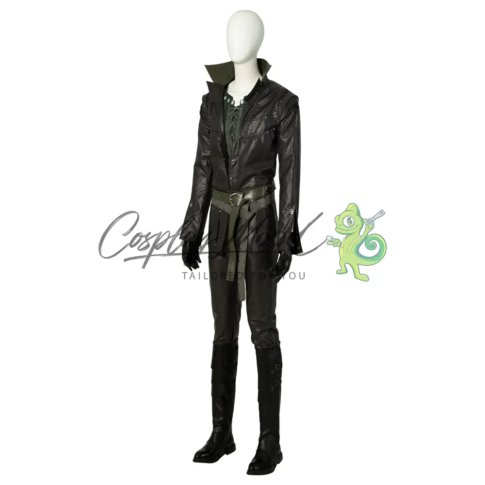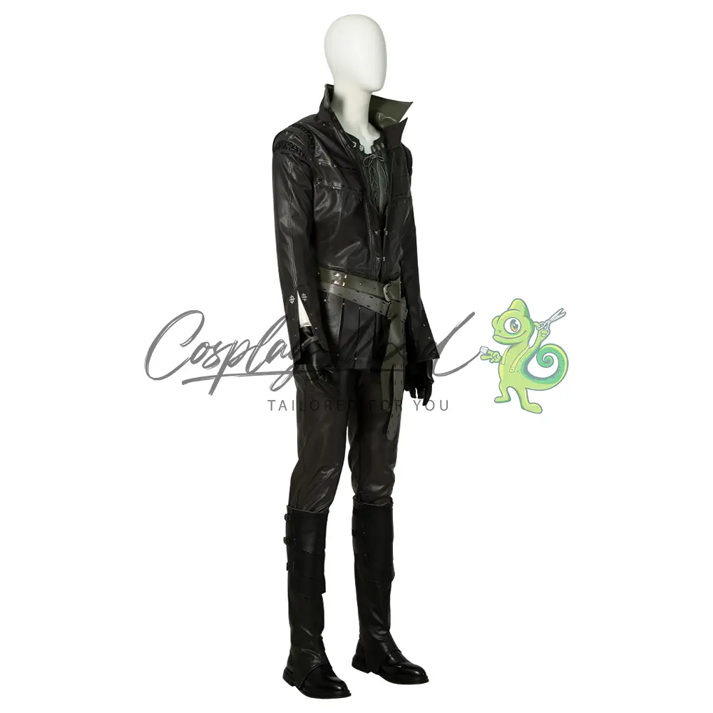 Giacca nera con decorazioni argentate, maglia con lacci color verde bottiglia, cinture, guanti neri, pantaloni lunghi neri, sovra scarpe neri con decorazioni.