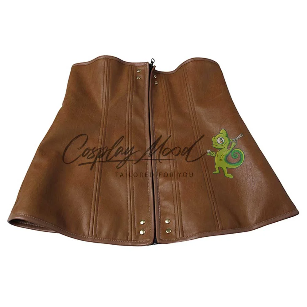 Camicia bianca, corpetto marrone, pantaloni in pelle pu con decorazioni in rilievo, guanti, bracciali, cintura con finte pietre, cintura marrone, borsini da legare alla vita, porta spada da mettere alla schiena, bracciali marroni e stivali in coordinato.