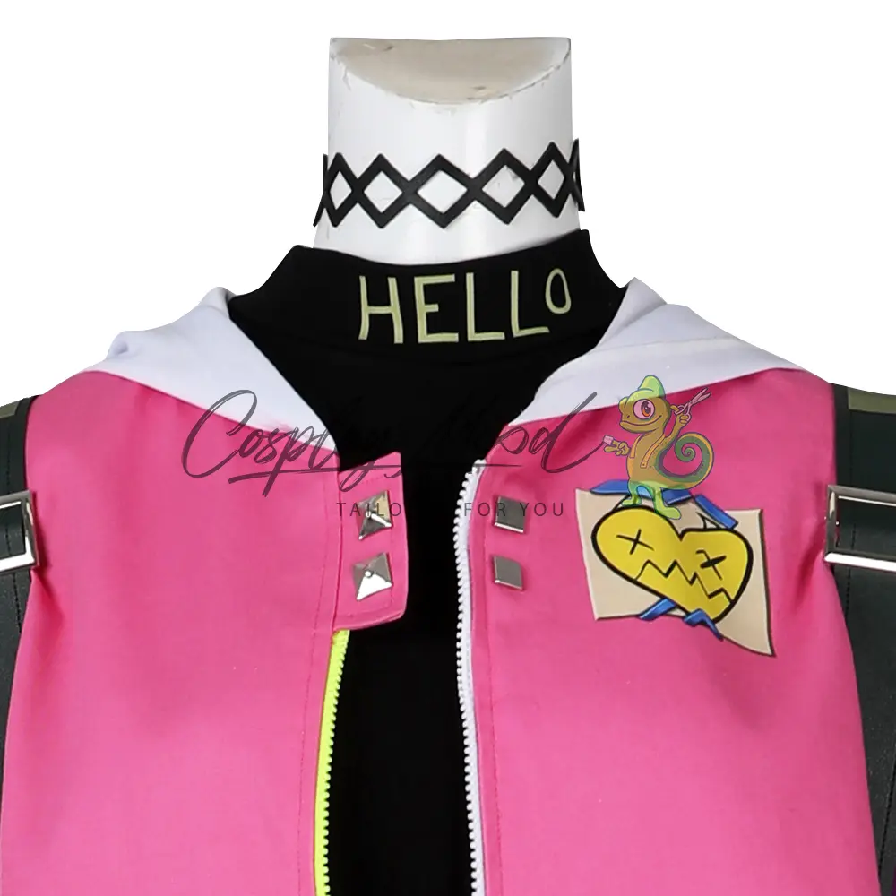 Giacca rosa con decorazioni gialle e colletto bianco, maglia a collo alto nera con scritta bianca, calze con texture e ginocchiera, cinture, borsello, pantaloncini corti con risvolto e disegno del gattino, bracciali, zainetto nero con zip e accessori, calzini azzurri, set di accessori con orecchini, collana, forcine, anelli, corna etc… Calzature abbinate ordinabili su richiesta.