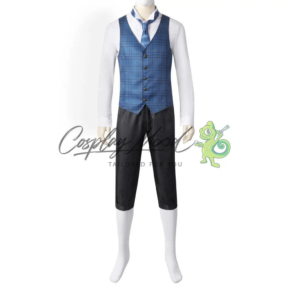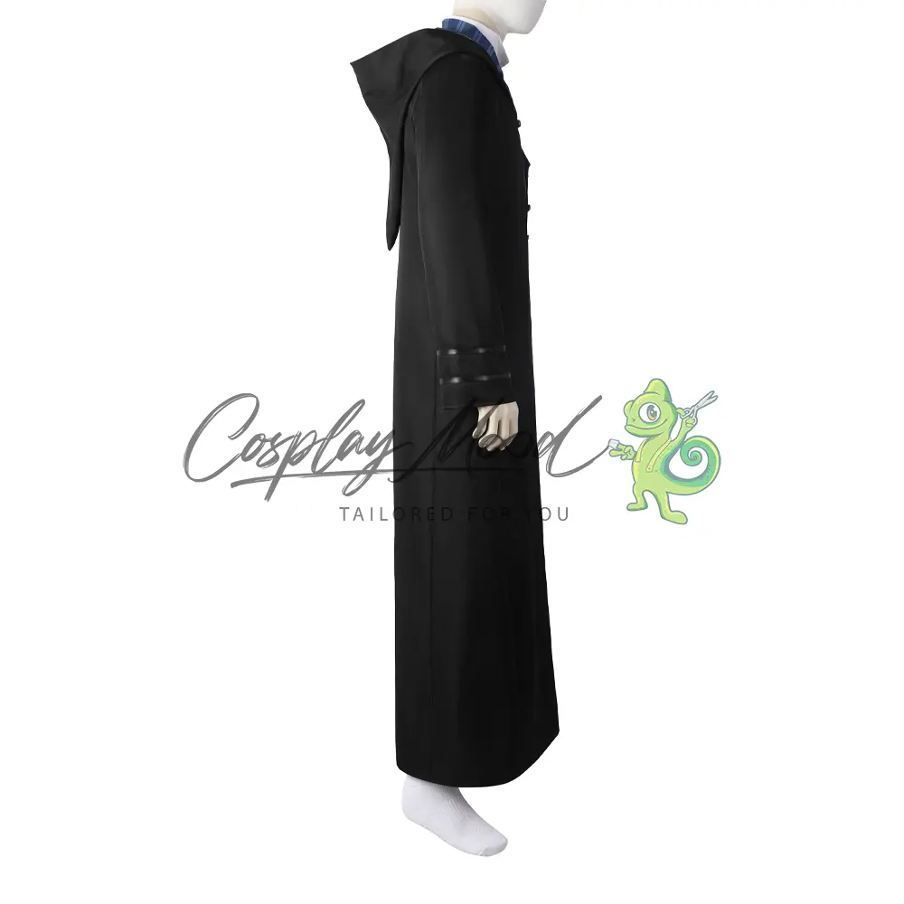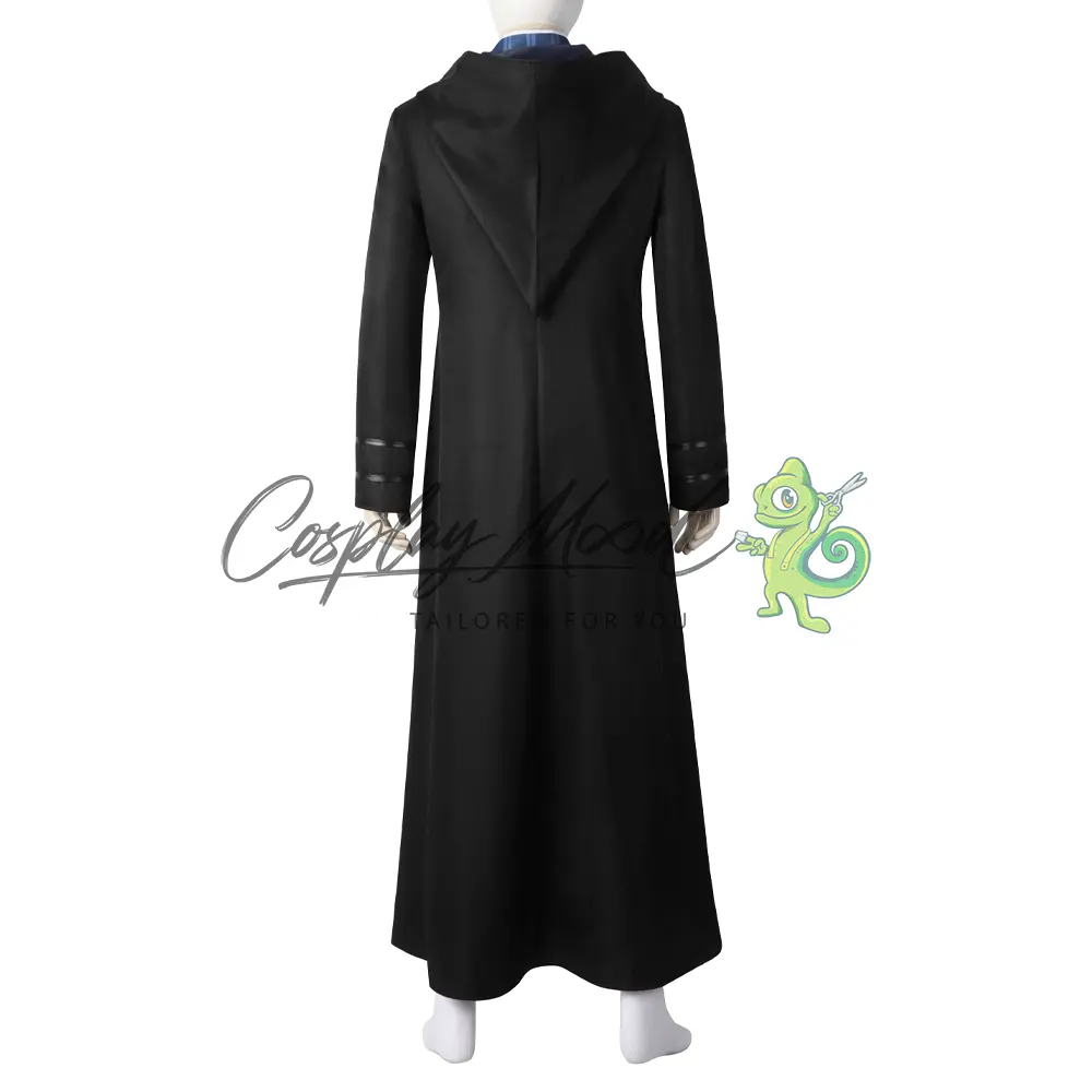 Camicia bianca, calze e cravattino, gilet, cappotto lungo nero con cappuccio e simbolo di Corvonero, pantaloni a pinocchietto.