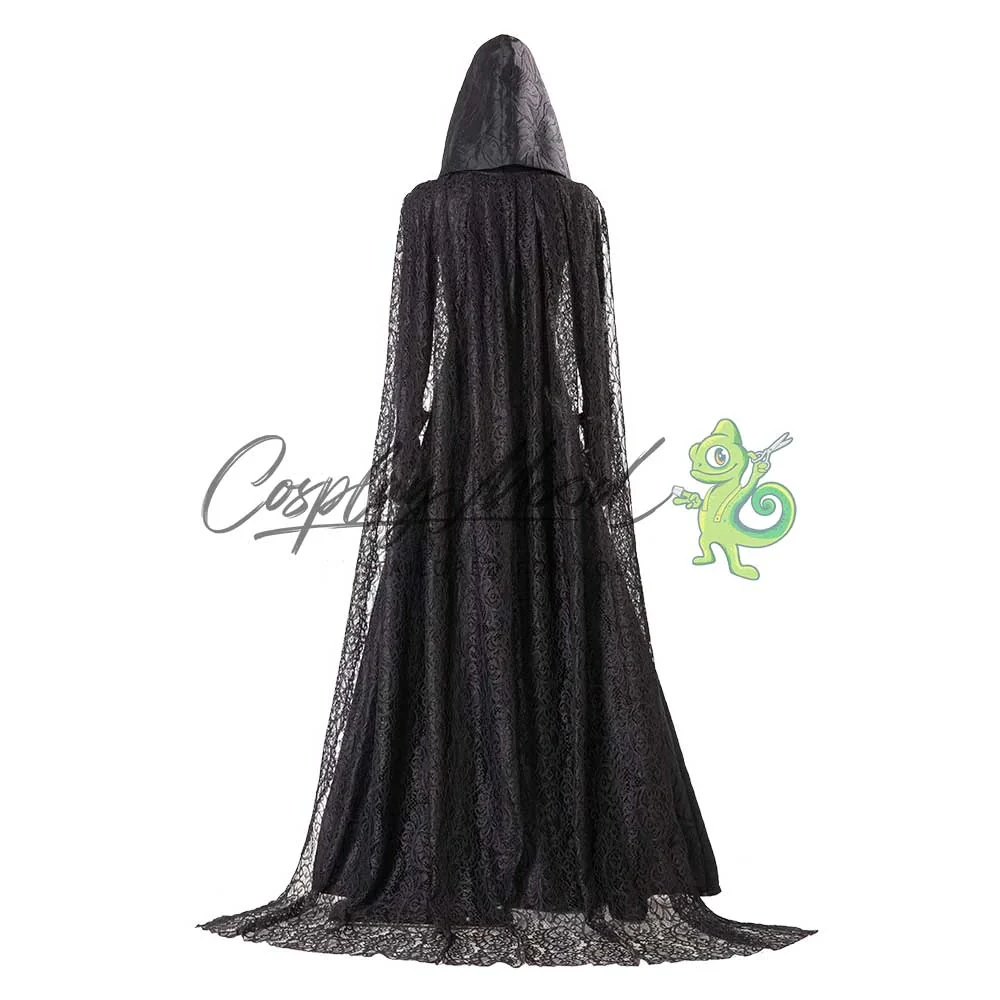 Abito lungo con cappuccio e decorato, cintura, guanti ed accessori vari.
