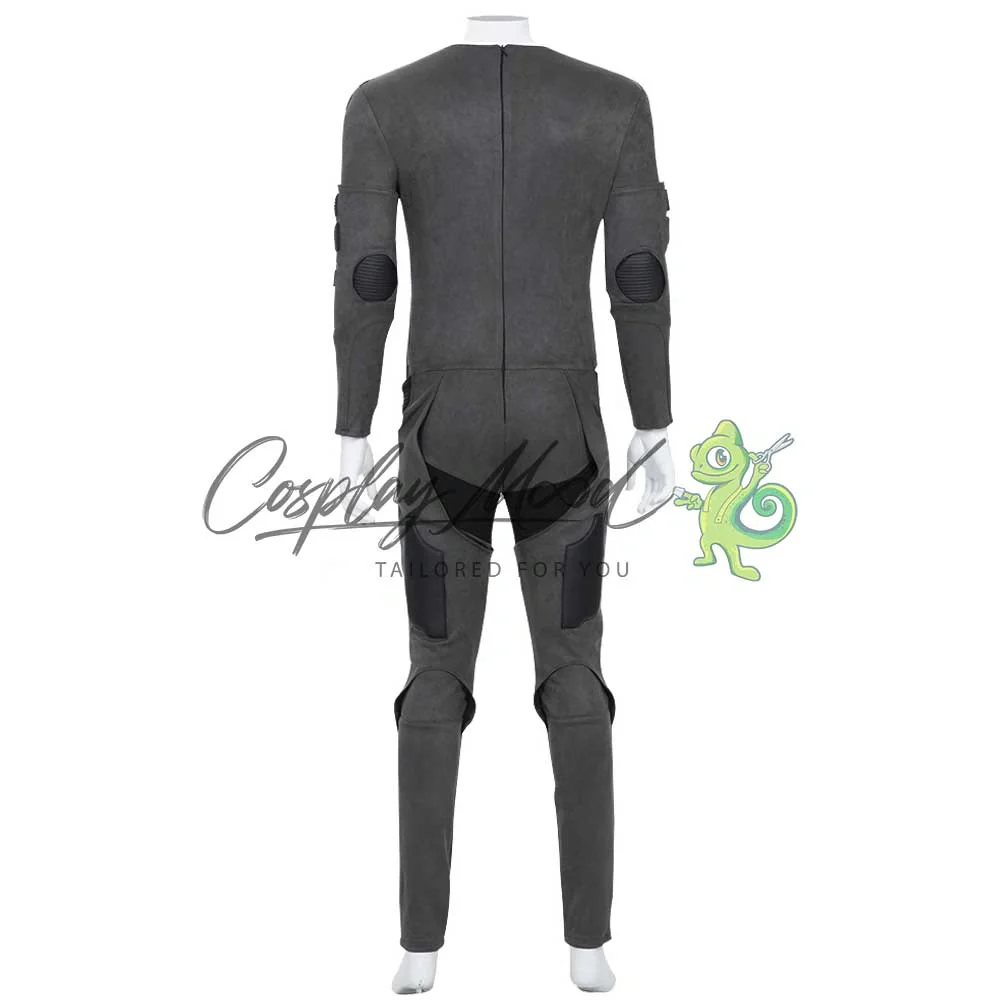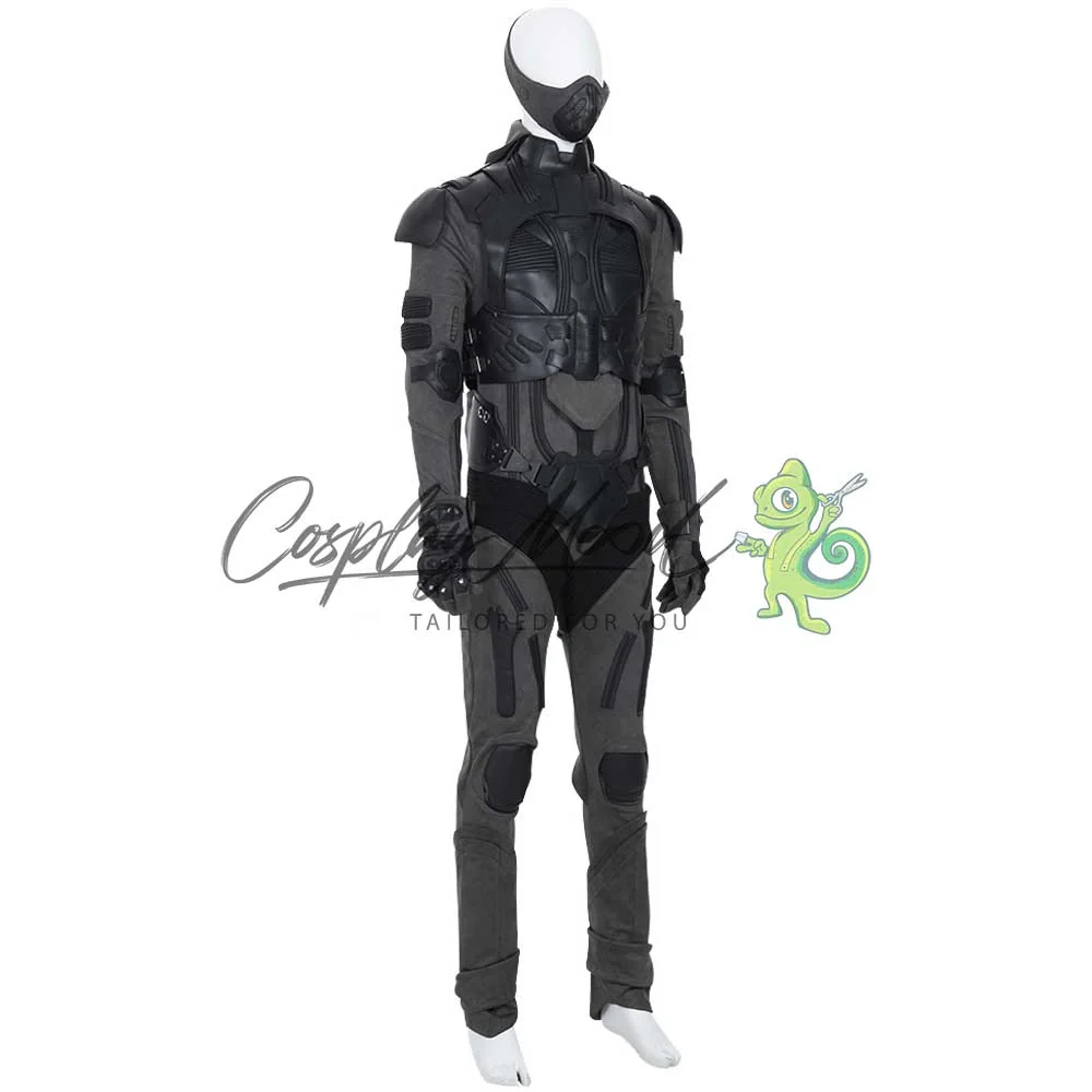 Tuta grigia con rinforzi e rilievi in varie zone del corpo, pettorina nera rinforzata, cintura occhiellata e rinforzata sempre di colore nero, guanti rinforzati stile motociclista, spalline nere, passamontagna grigio, maschera nera con fascia grigia e copri braccia.