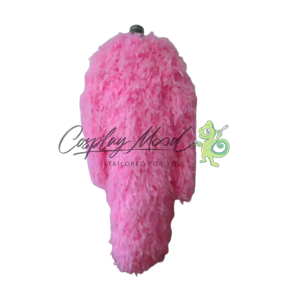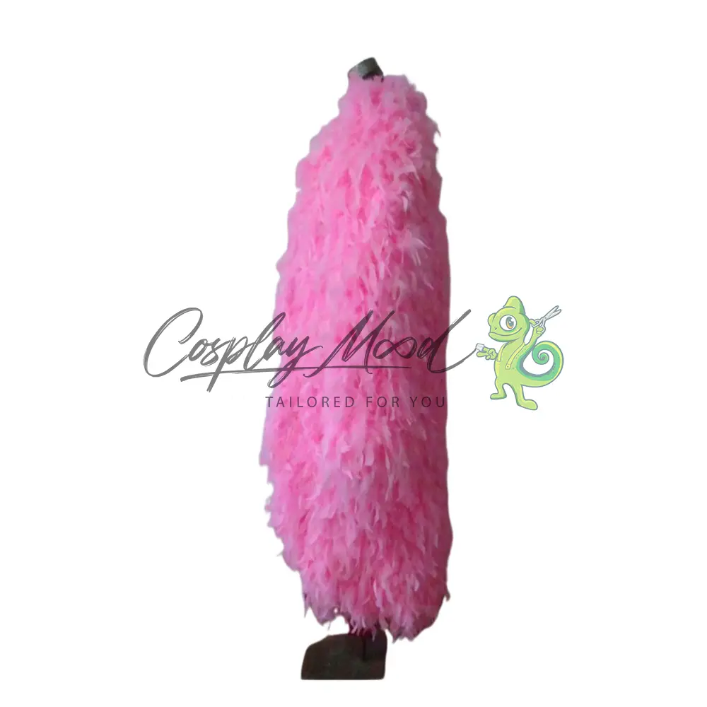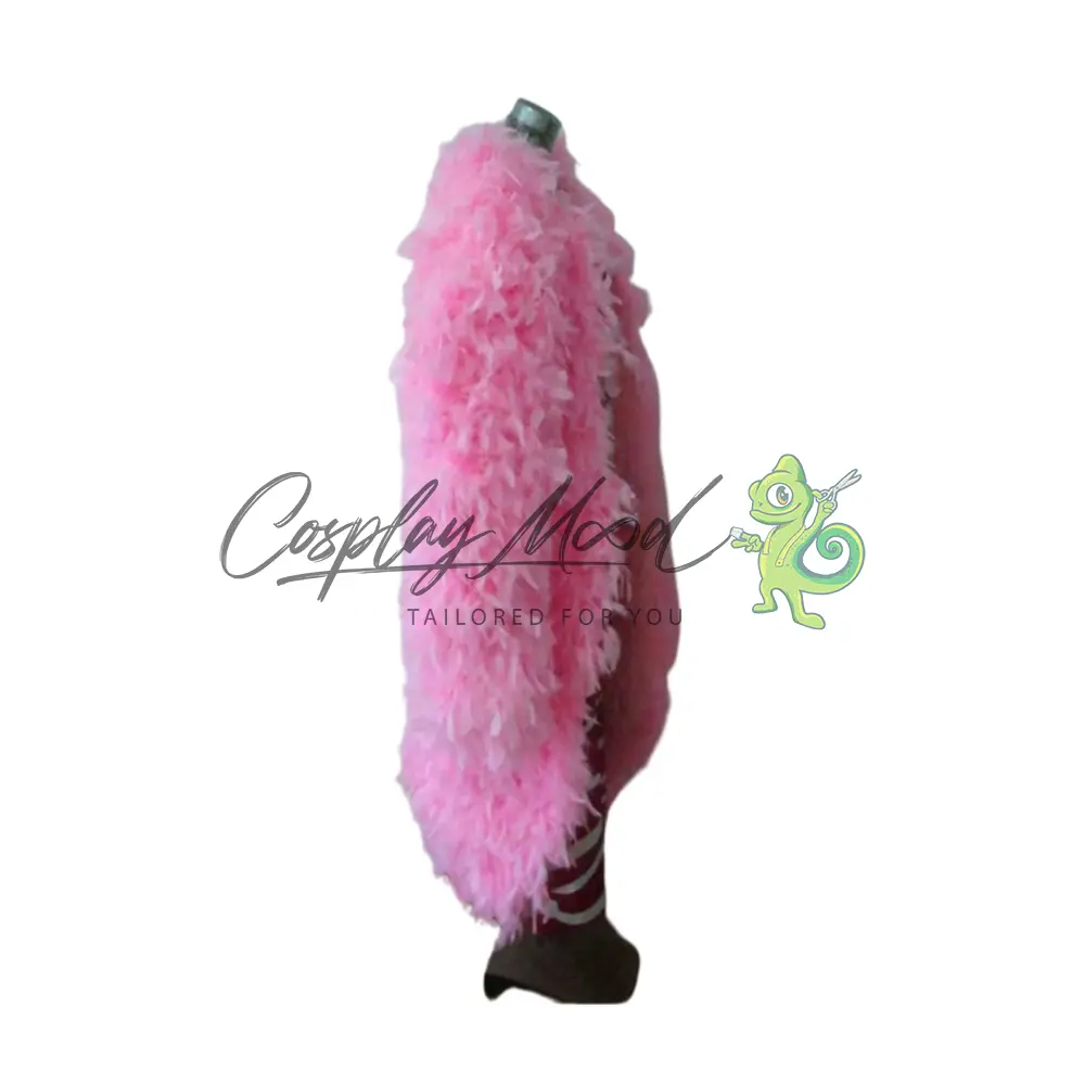 Mantello lungo in piume rosa sintetiche, l’elemento distintivo che rende Doflamingo immediatamente riconoscibile, camicia bianca con bottoni grigi frontali per un look audace e spavaldo, pantaloni rossi con stampe bianche astratte, design fedele all’anime per completare l’outfit.