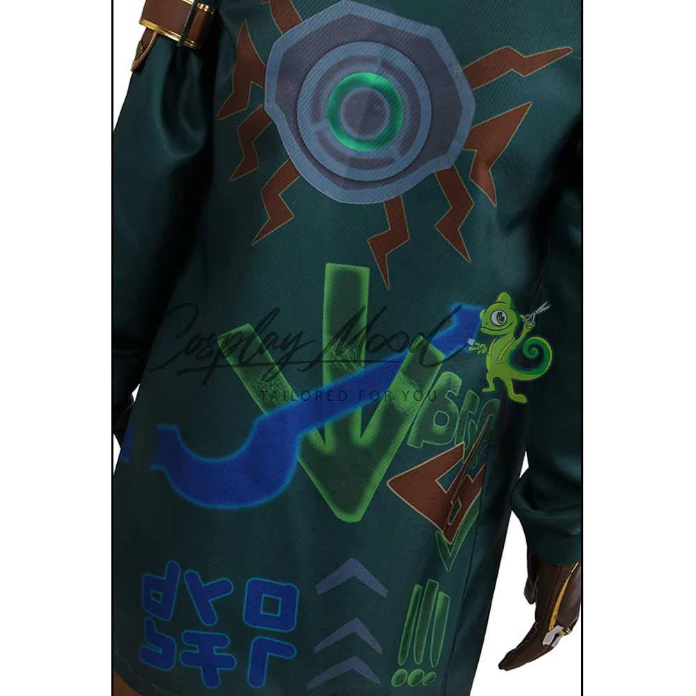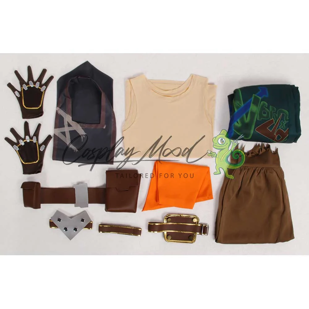 Una canottiera di colore beige, una maglietta smanicata con stampa, collarino – bandana arancione, guanti, sopra veste verde con cappuccio con motivi stampati sul retro schiena, cintura con borsette in pelle PU e pantaloni. Le scarpe, la maschera e il suo over board sono esclusi (ordinabili separatamente).