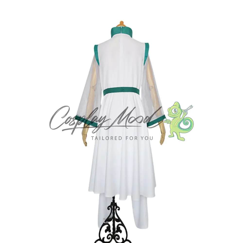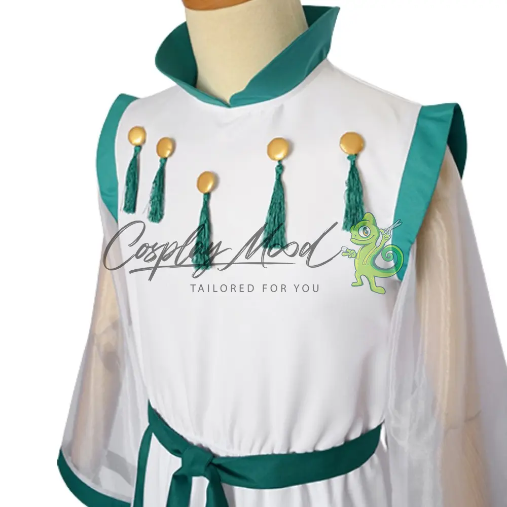 Tunica lunga bianca con decorazioni verdi, maniche lunghe trasparenti e bottoncini dorati posti in posizione centrale con nappa verde, cintura in coordinato e pantaloni lunghi bianchi.