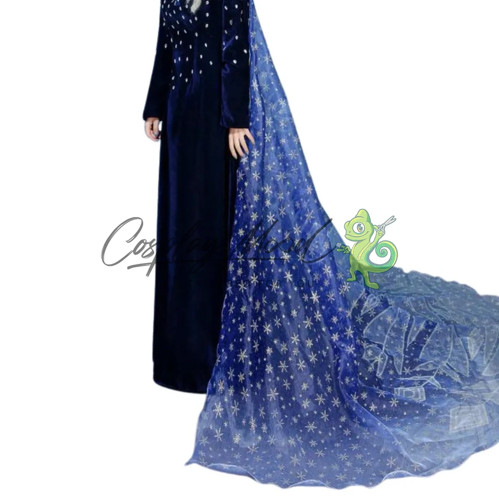 Vestito lungo blu notte con decorazioni sul corsetto e particolari in rilievo all’altezza del collo, mantello lungo azzurro con finiture a stella e peloncino nella parte alta.