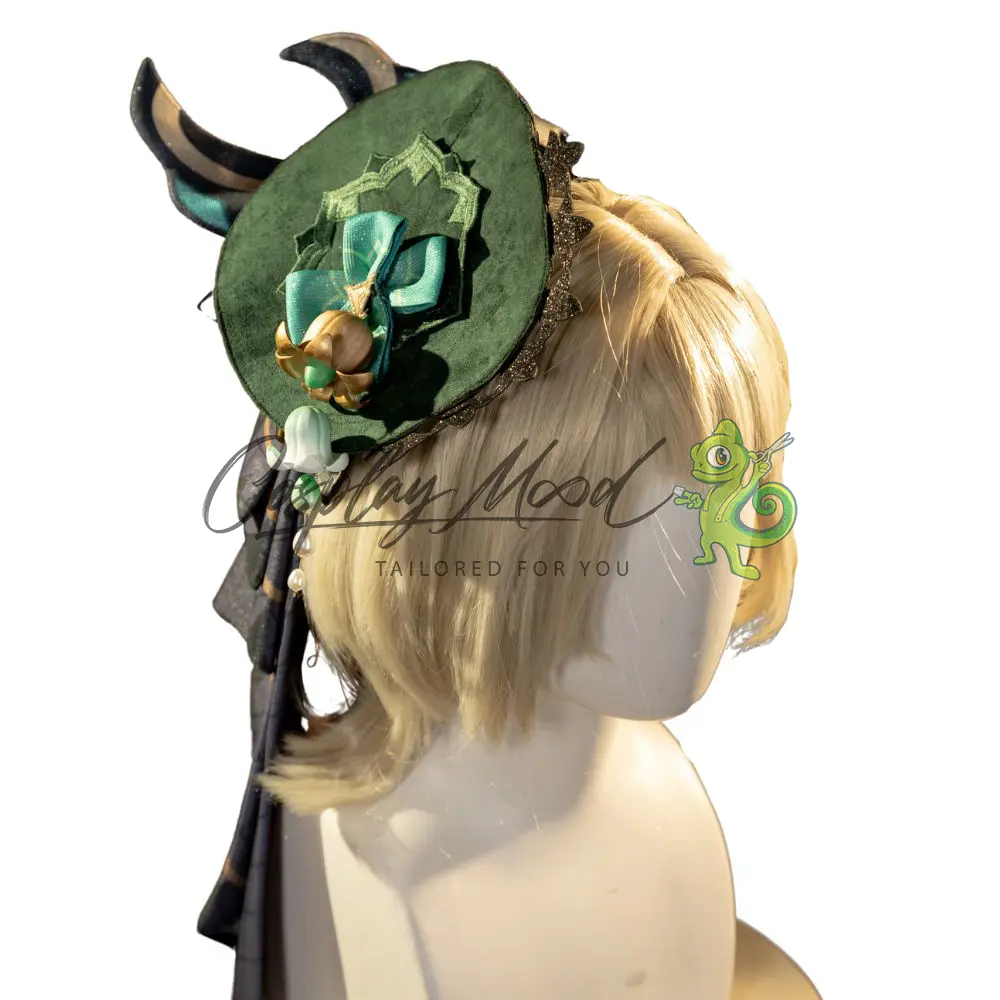 Camicetta bianca con maniche corte, maniche marroni con fiocchi neri, guanti, gilet marrone con finiture, collana, fiocco nero con decorazioni dorate, gonna lunga verde e sotto gonna bianco con punte verde chiaro, occhiali, set di fiocchi, orecchini e cappello con decorazioni e velo nero posteriore.
