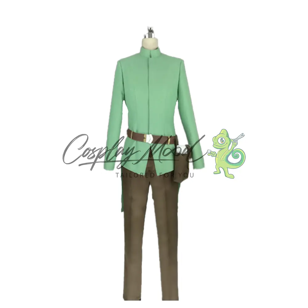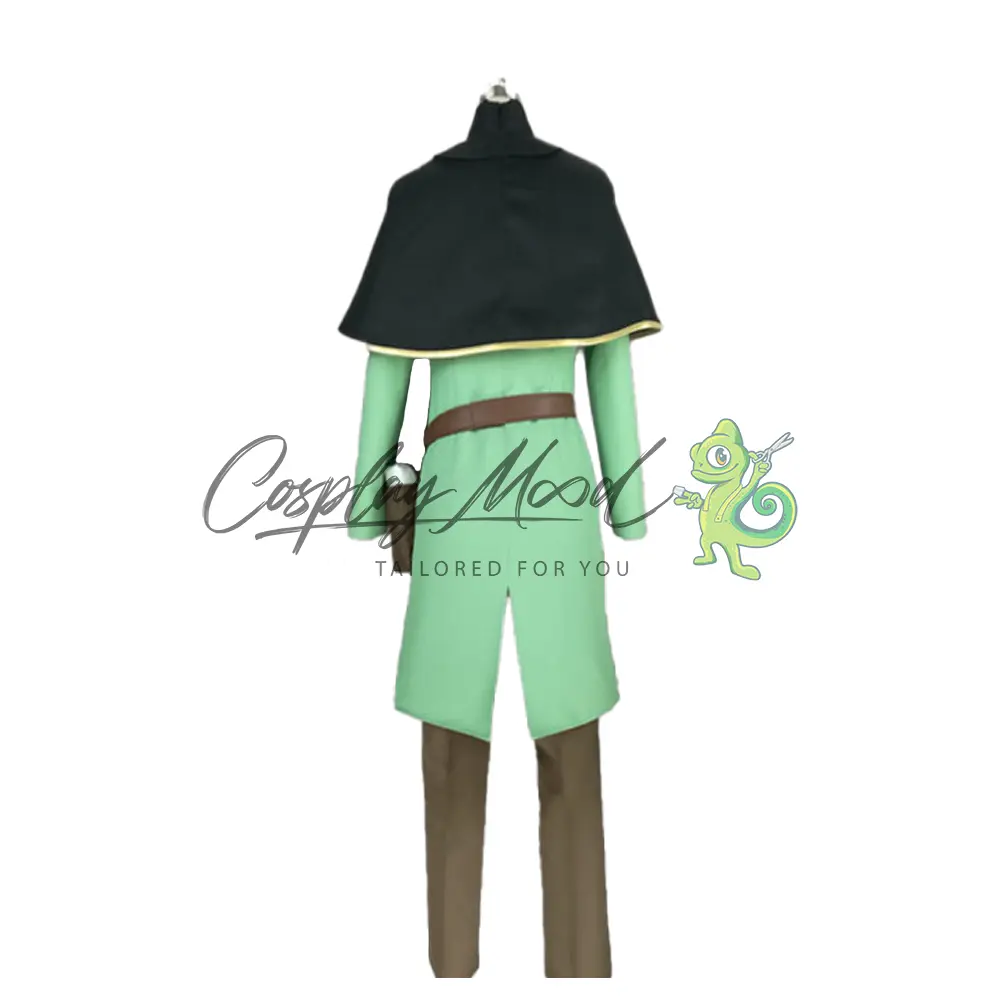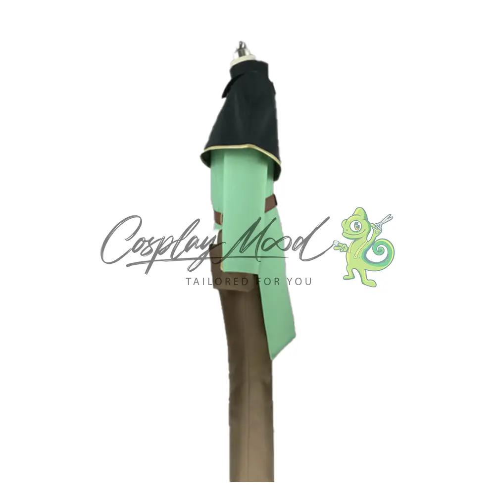 Mantellina nera con bordi dorati bottoncino e stemma dell’ordine, vestito verde con collo alto e maniche lunghe, pantaloni marroni e cintura con porta grimorio.