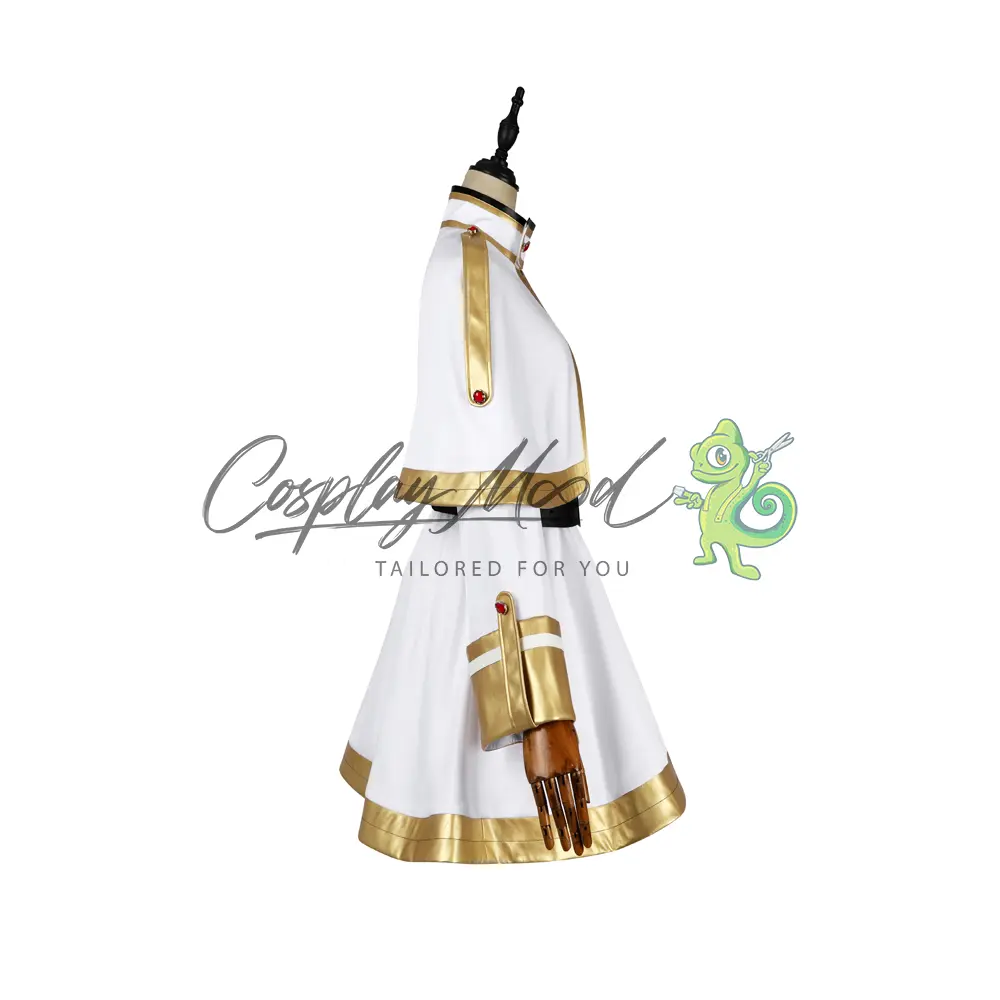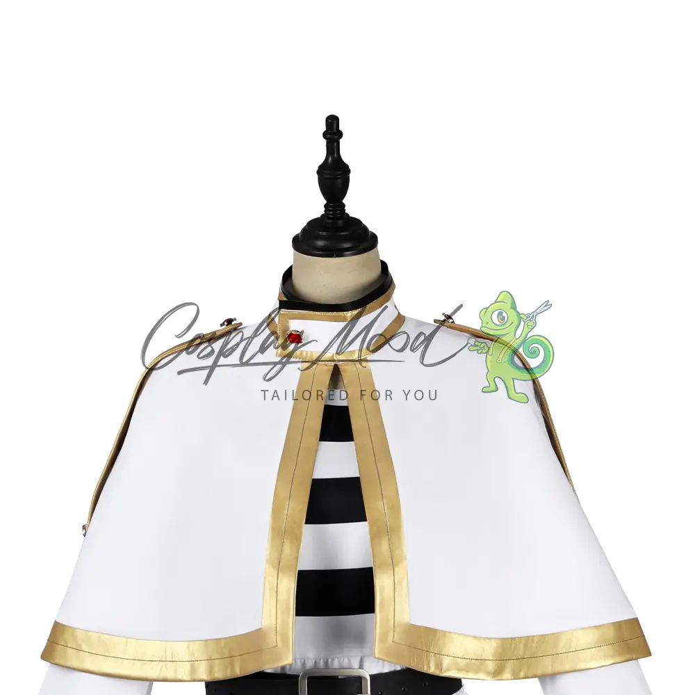Maglia bianca a righe nere, mantellina bianca con bordi dorati, cintura nera con fibbia, orecchie da elfo con orecchini, colletto nero e calze nere.