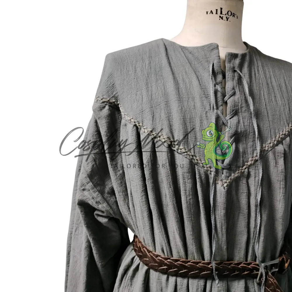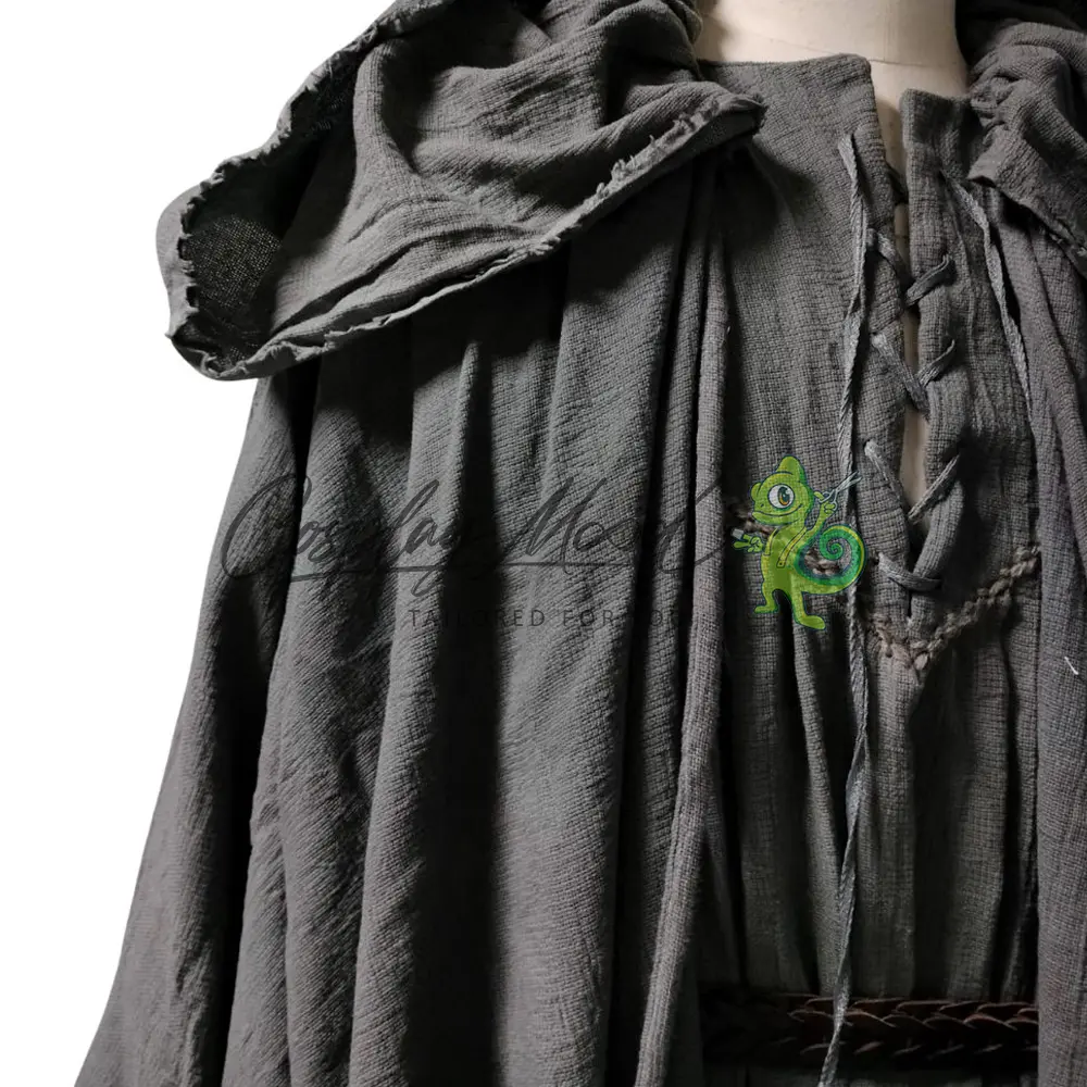 Tunica lunga grigio scuro con dettagli medievali, un abito ampio e fluente, perfetto per il look da mago errante, mantello con cappuccio oversize e ampio cappello, elemento essenziale per ricreare il fascino misterioso di Gandalf.