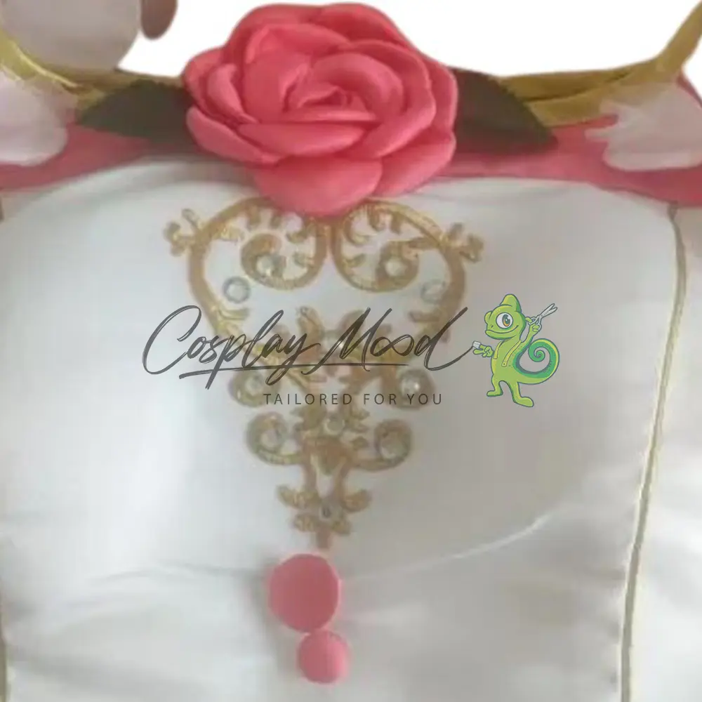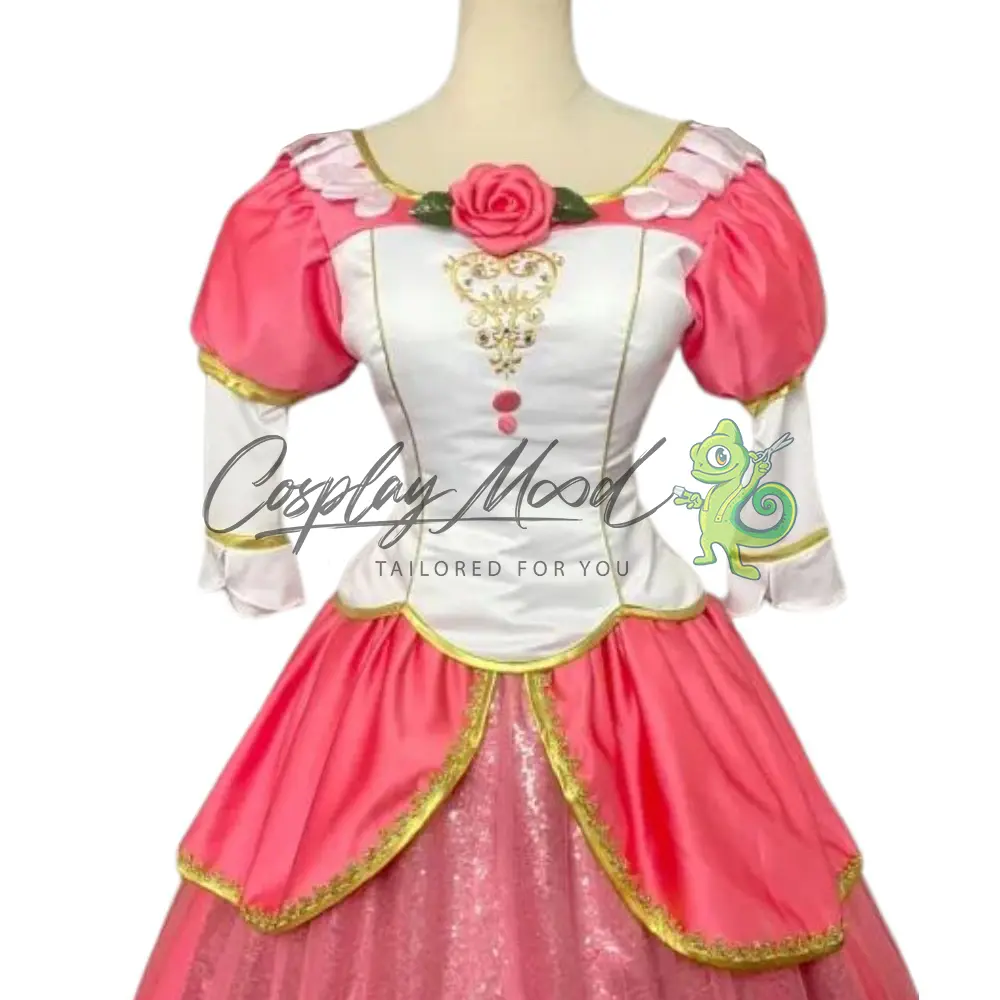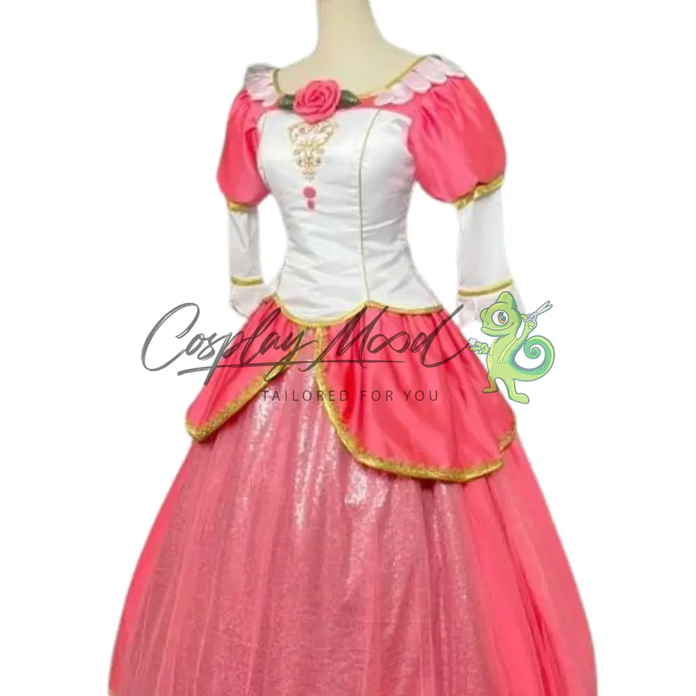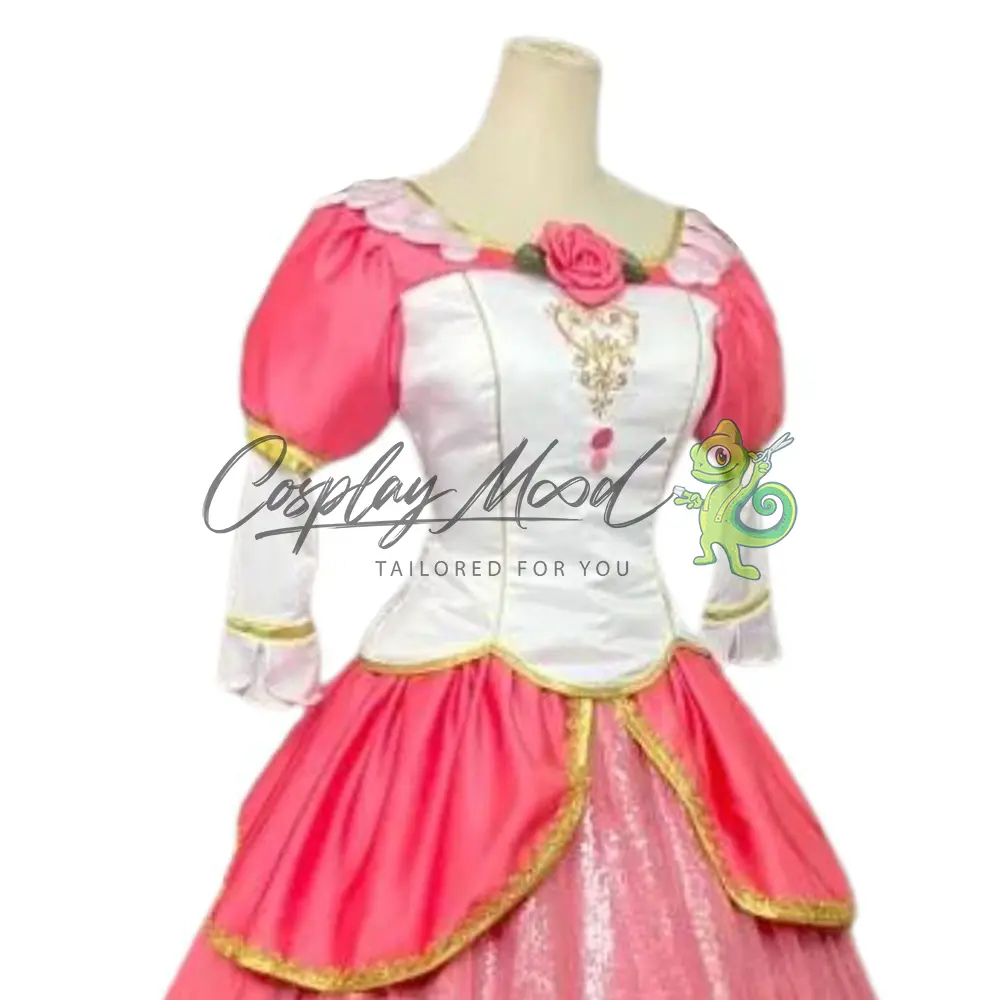 Abito lungo rosa con dettagli dorati, un vestito principesco con finiture eleganti, corpetto bianco con decorazioni floreali, design romantico che esalta la silhouette, maniche a sbuffo rosa e bianche, dettaglio raffinato che richiama lo stile delle principesse classiche. Gonna ampia con strati di tulle scintillante, per un effetto etereo e da vera ballerina.
