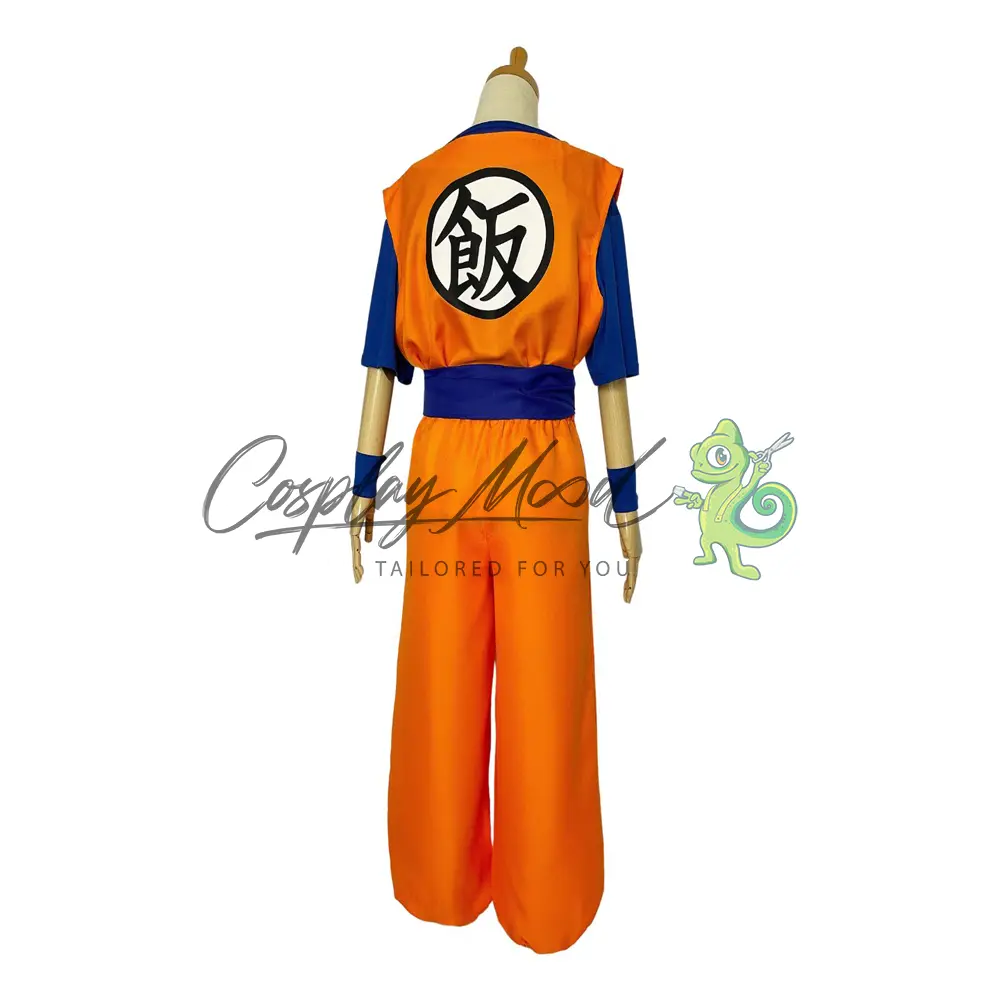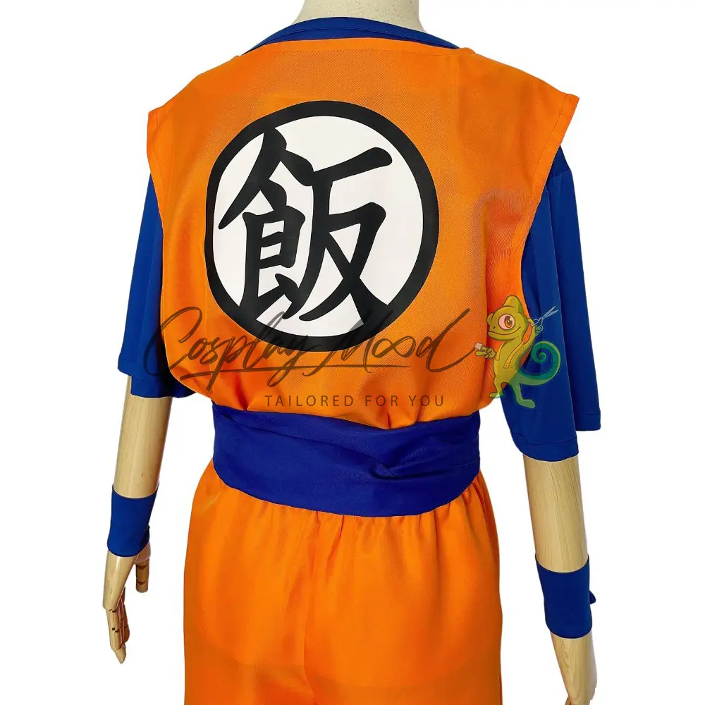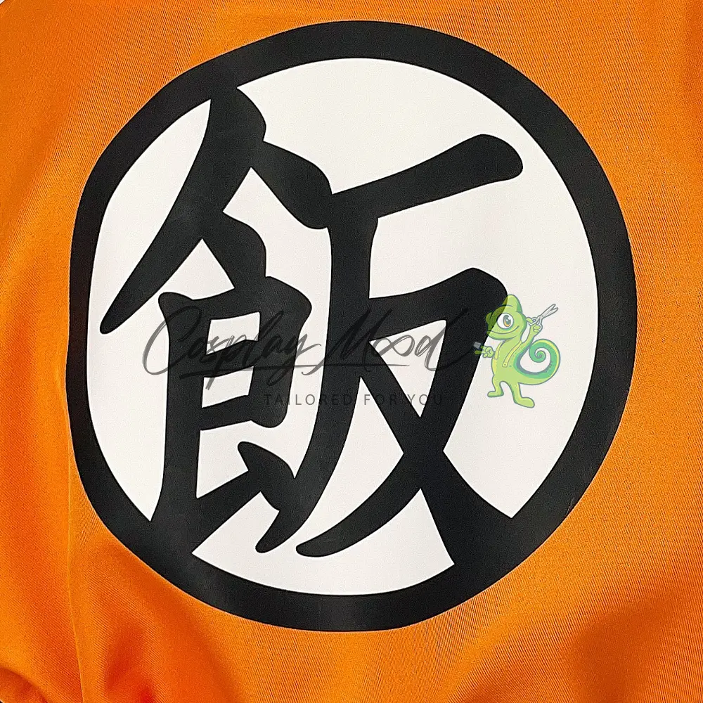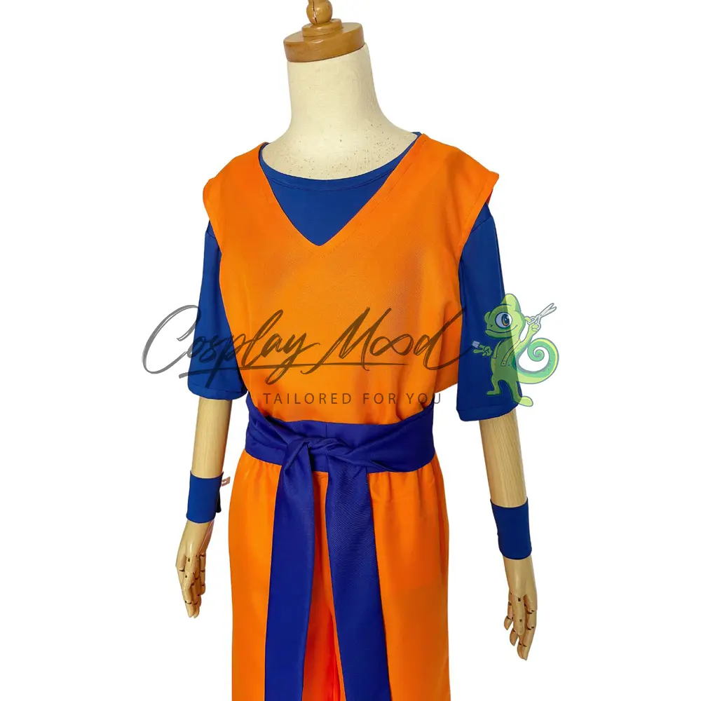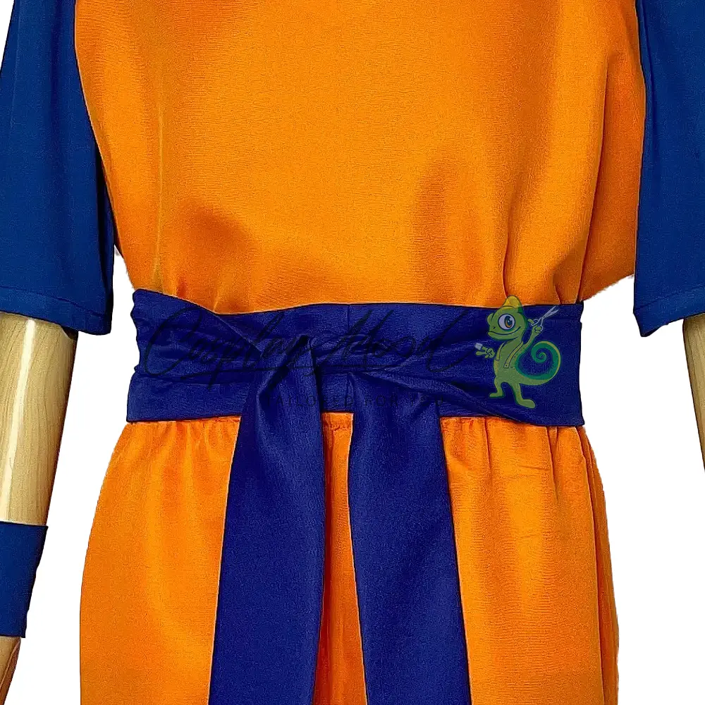 T-Shirt blu tipica dei guerrieri Saiyan, tunica arancione da allenamento con logo posteriore, fascia in vita sempre color blu, polsini in coordinato e pantaloni ampi color arancio.