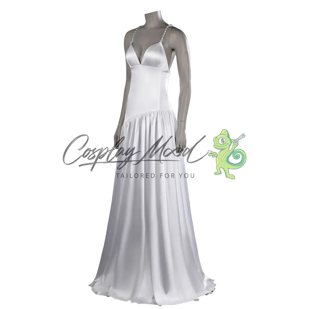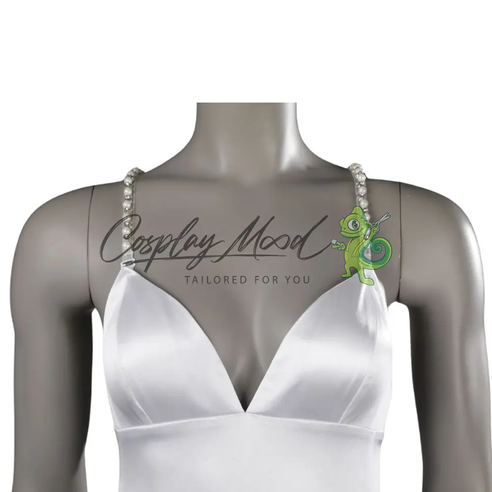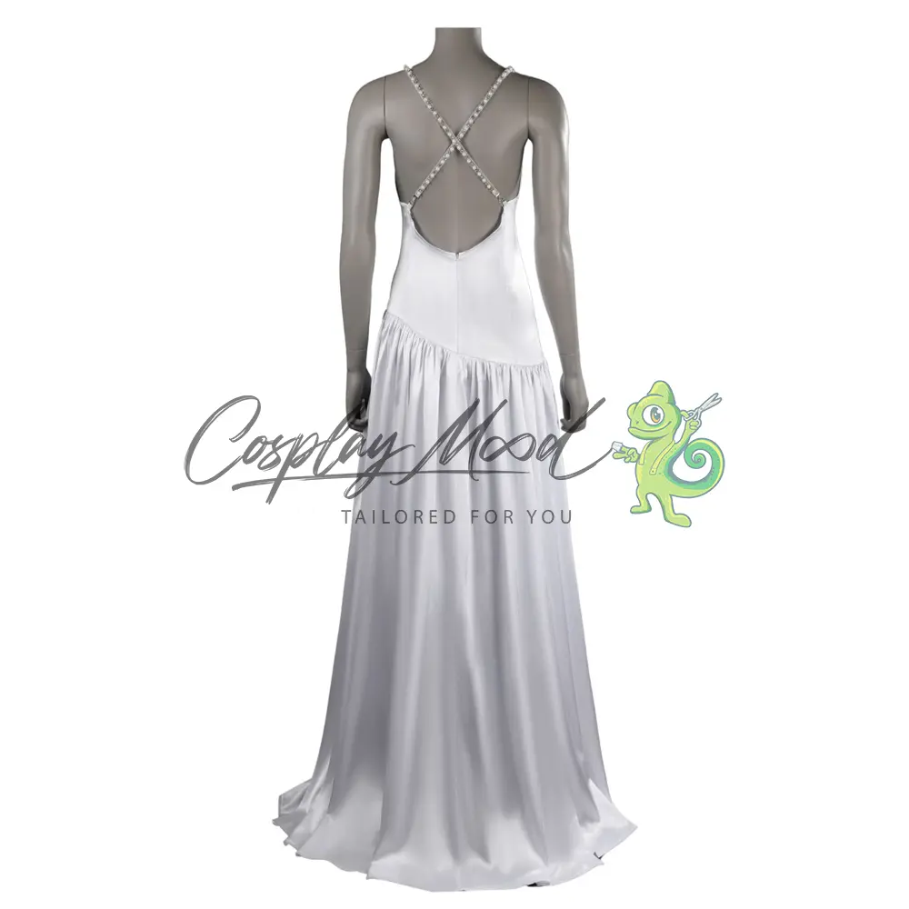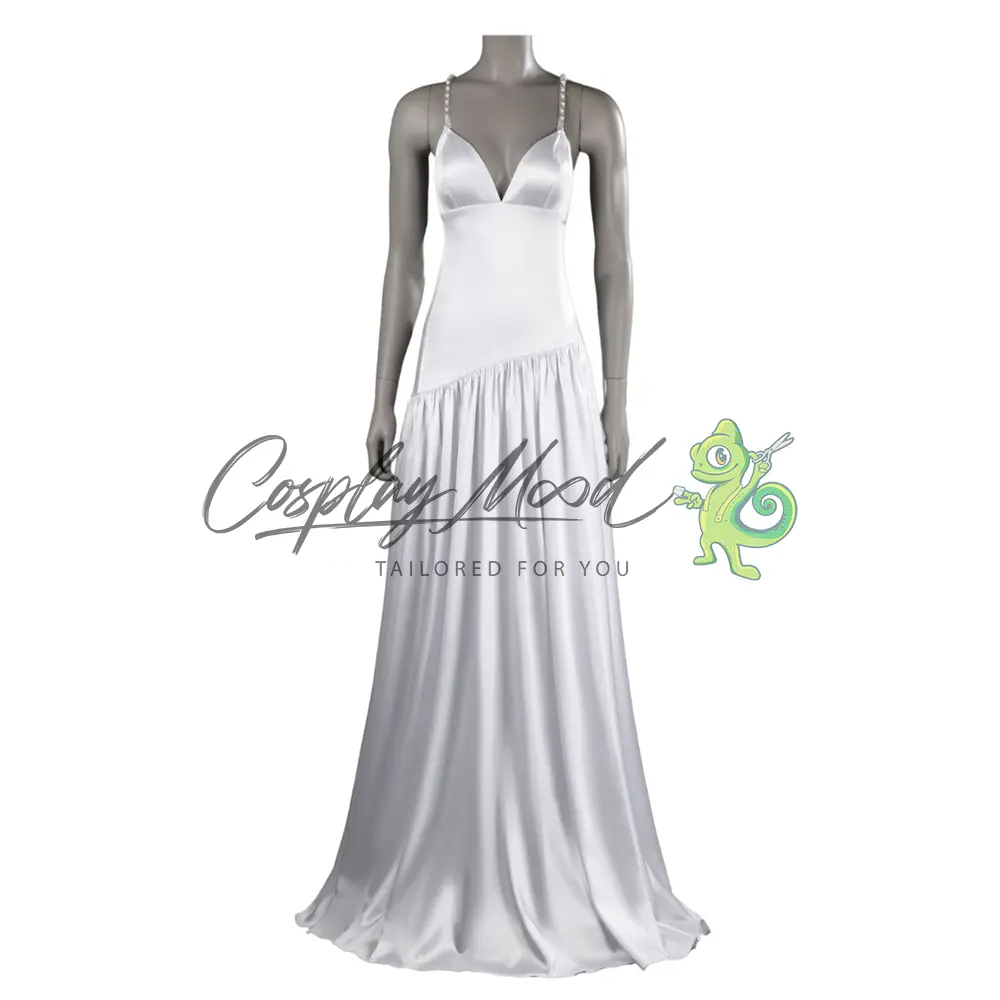 Vestito lungo bianco con spalline decorate ed orecchini lunghi.