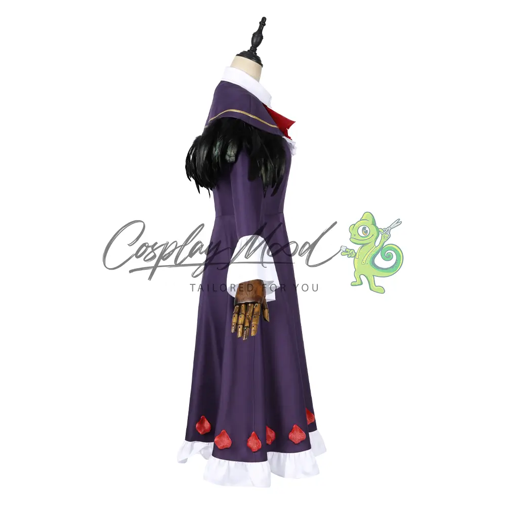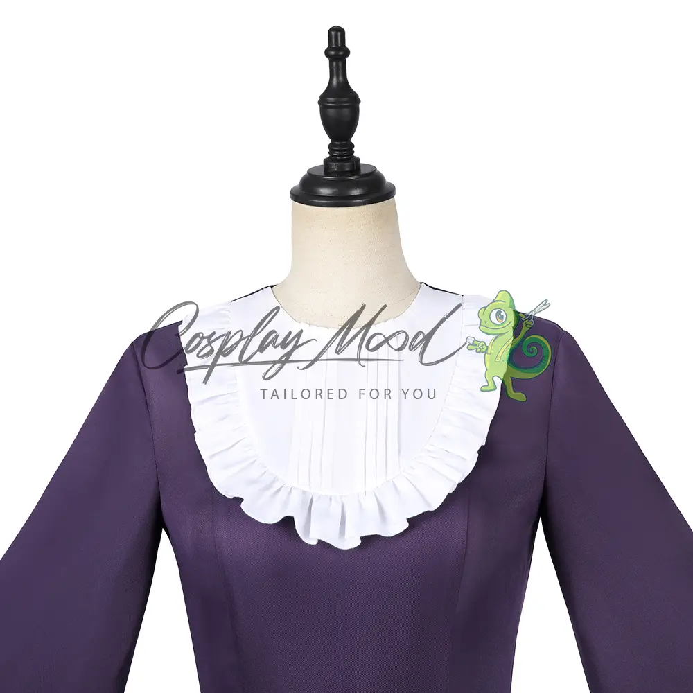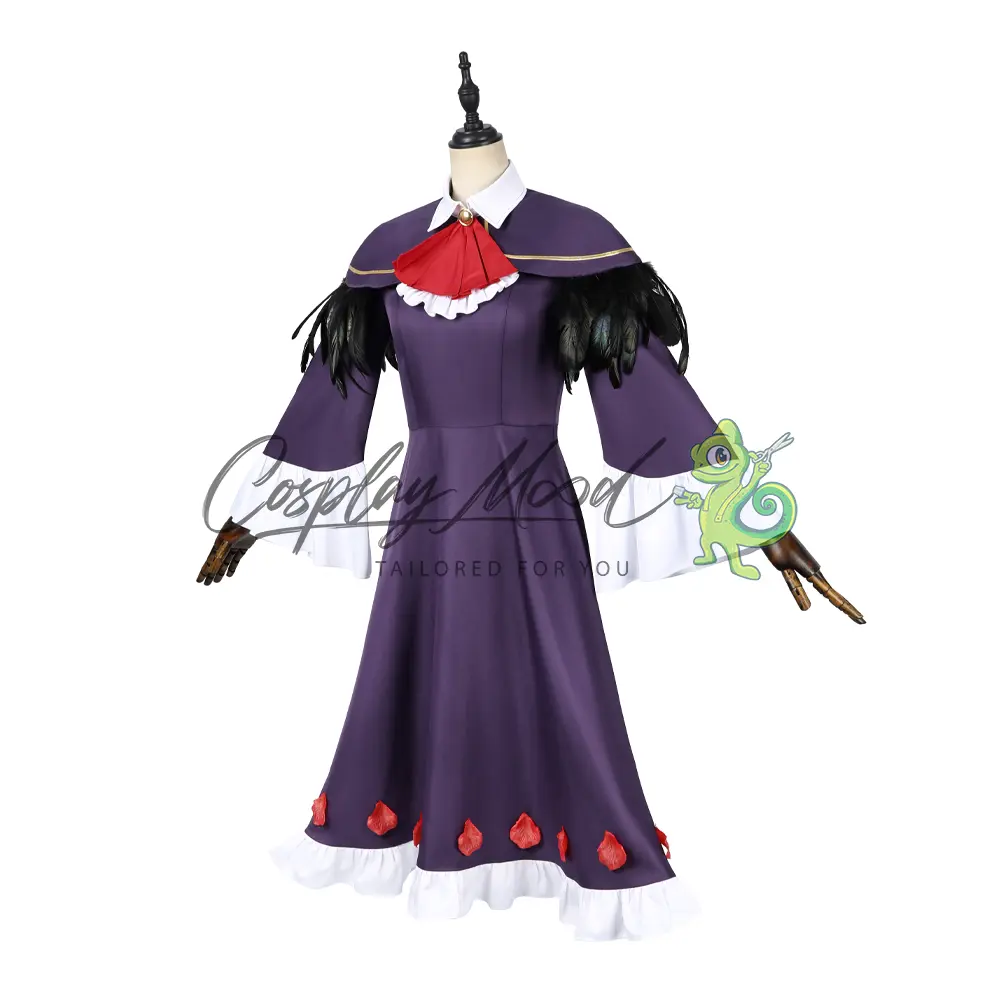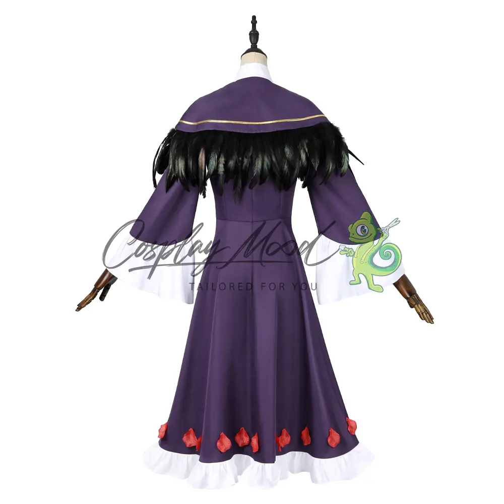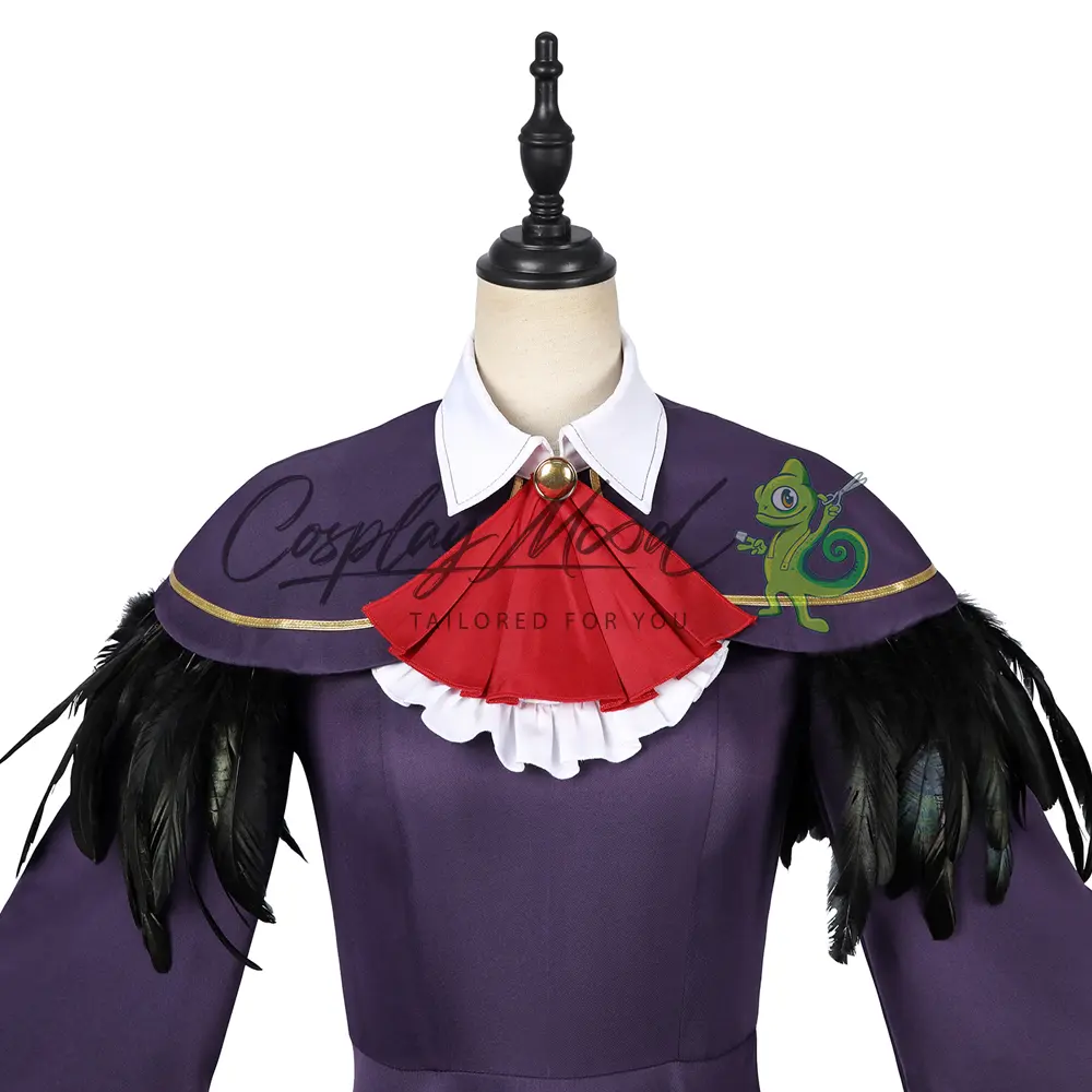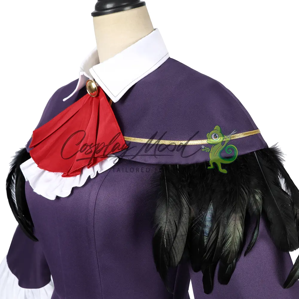 Passata nera, vestito viola con colletto bianco, maniche ampie e bordo inferiore dello stesso colore, corredato da petali rossi, mantellina con piume nere, spilla con fiocco rosso, calze nere.
