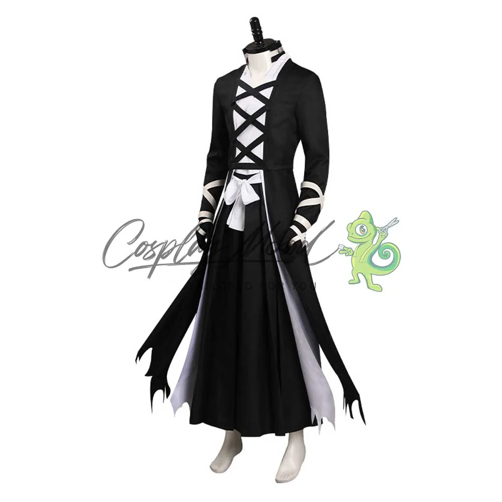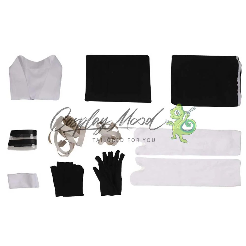 Maglia bianca, lunga giacca nera, fasce per le braccia, fascia in vita, pantaloni hakama neri, guanti neri, calze bianche, collare.