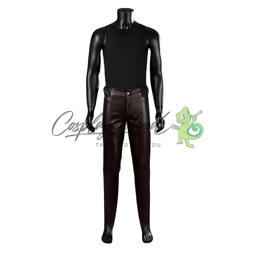 Maglia con braccio stampato (disponibile su richiesta anche in EVA Foam), canottiera nera, gilet nero con decorazioni, piastrine, occhiali, anelli, cintura, pantaloni lunghi marroni in eco pelle. Calzature abbinate disponibili su richiesta.