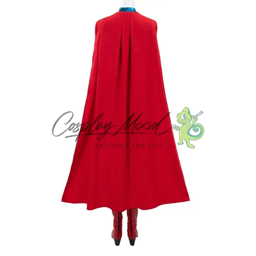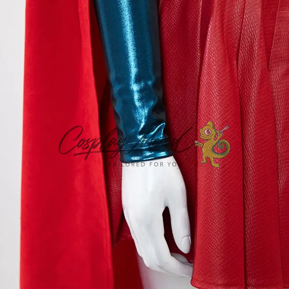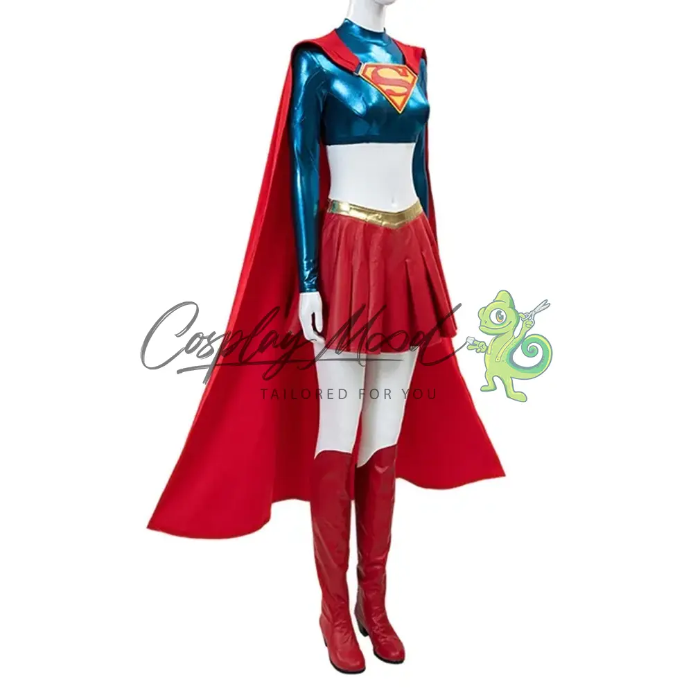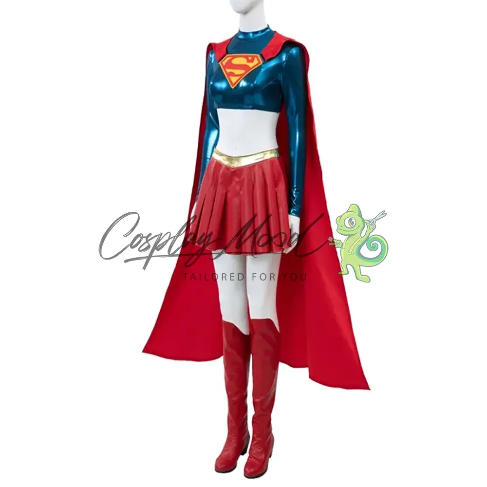 Ampio mantello rosso tipico di Supergirl con fissaggio frontale, maglia azzurra a maniche lunghe con logo centrale in rilievo, gonna a balze rossa con fascia centrale dorata e stivali rossi lunghi.