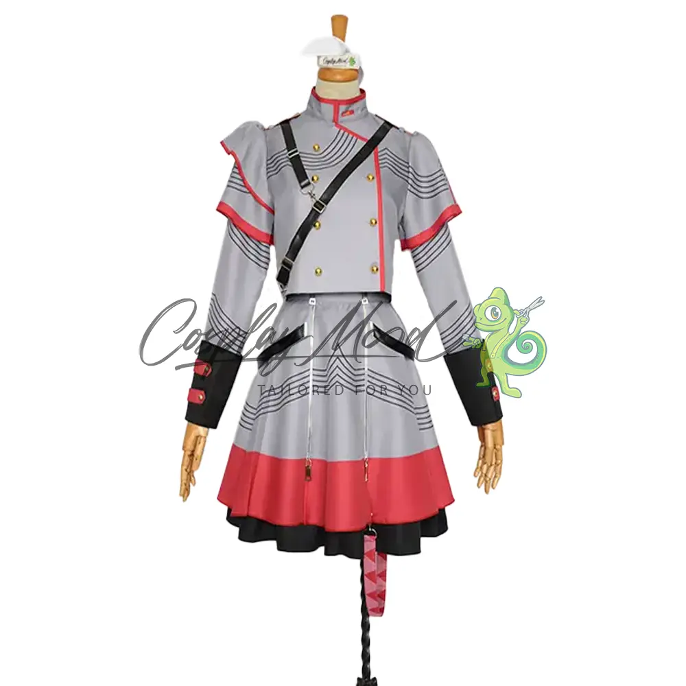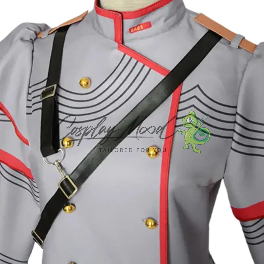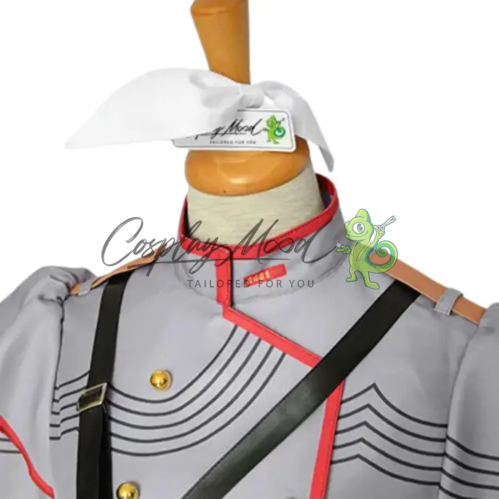Fiocco per capelli bianco, giacca grigia con decorazioni, gonna in coordinato con finiture rosse e cinture in eco pelle.