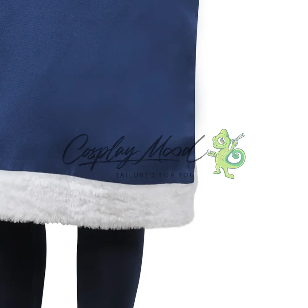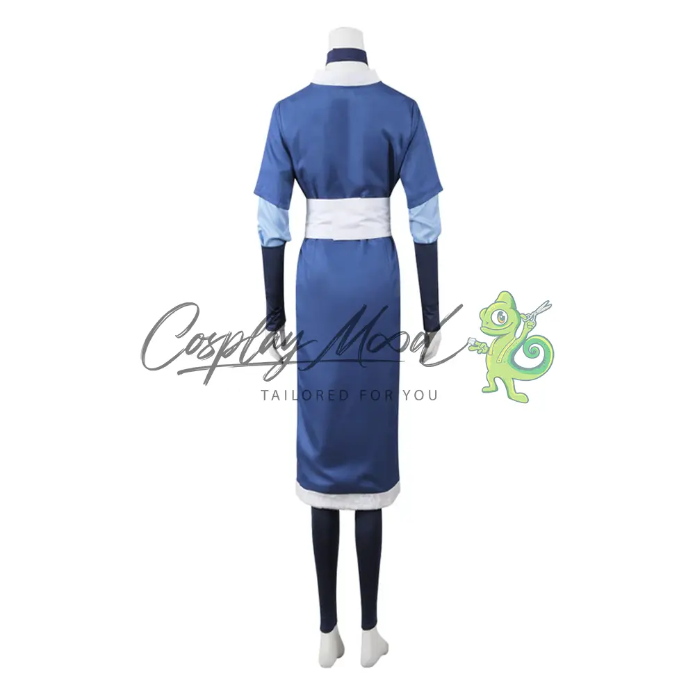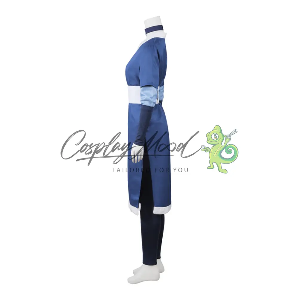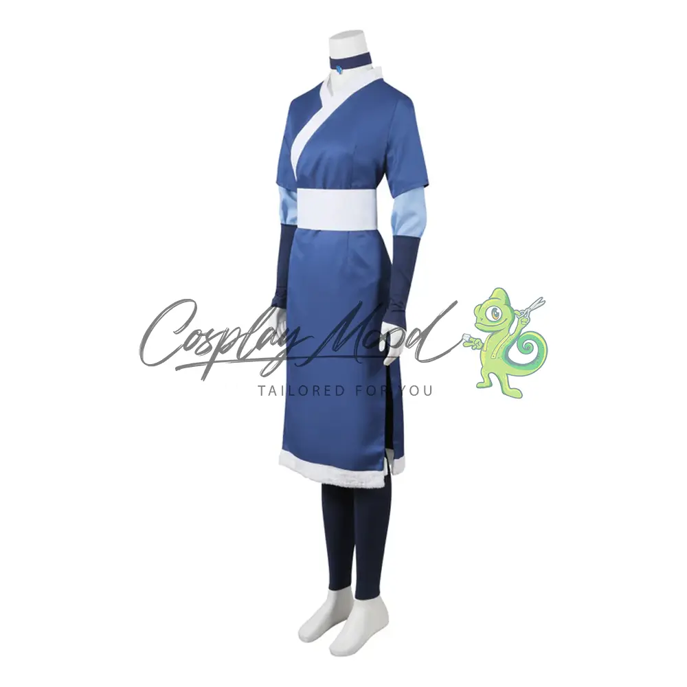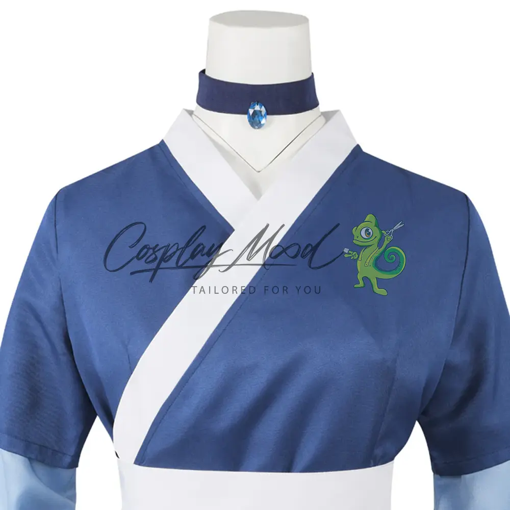 Tunica blu a kimono con dettagli bianchi, classico abito da maestra dell’Acqua, cintura bianca in vita per un perfetto equilibrio tra forma e funzionalità, manicotti lunghi blu con dettagli chiari, pantaloni aderenti blu scuro, perfetti per la mobilità necessaria nel Waterbending, materiali resistenti e traspiranti, ideali per lunghe sessioni cosplay e convention.