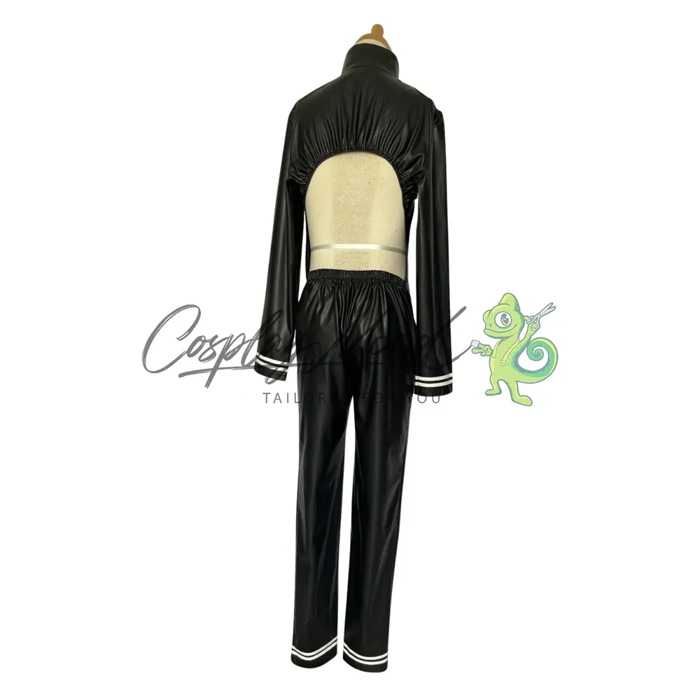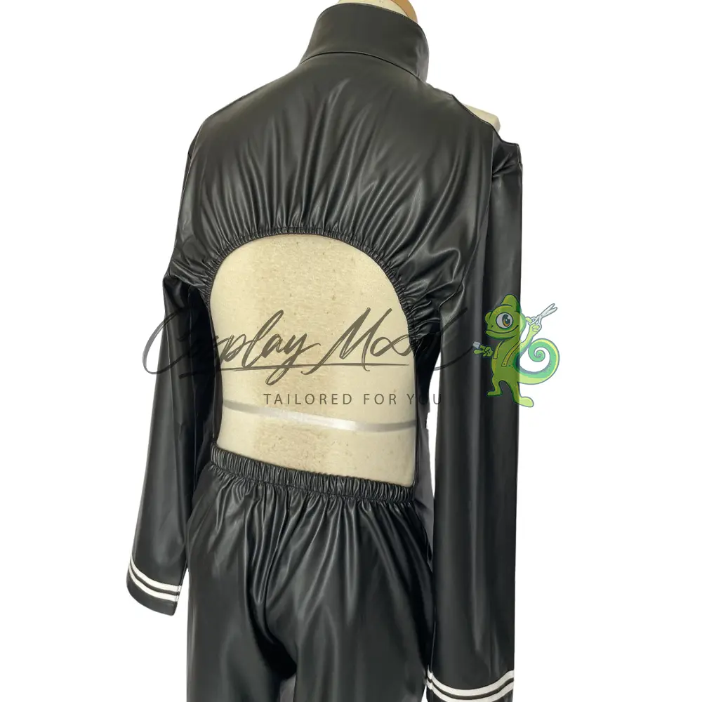 Maglia nera con apertura posteriore e decorazioni bianche, pantaloni neri lunghi, shorts sempre neri e giacca in coordinato con finitura intrecciata frontale.