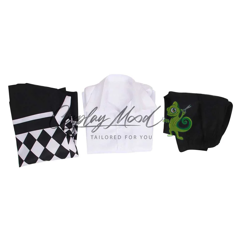 Composto da una camicia, haori con motivi a scacchi ed ampi pantaloni neri.