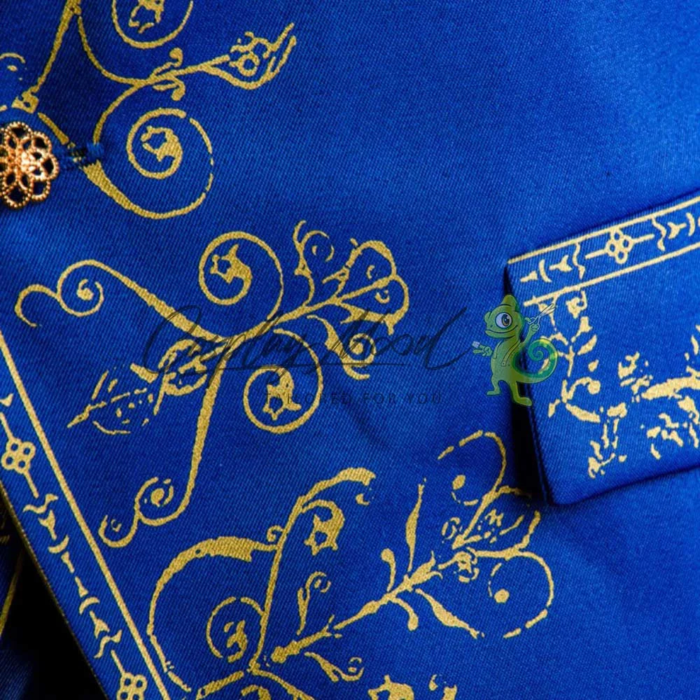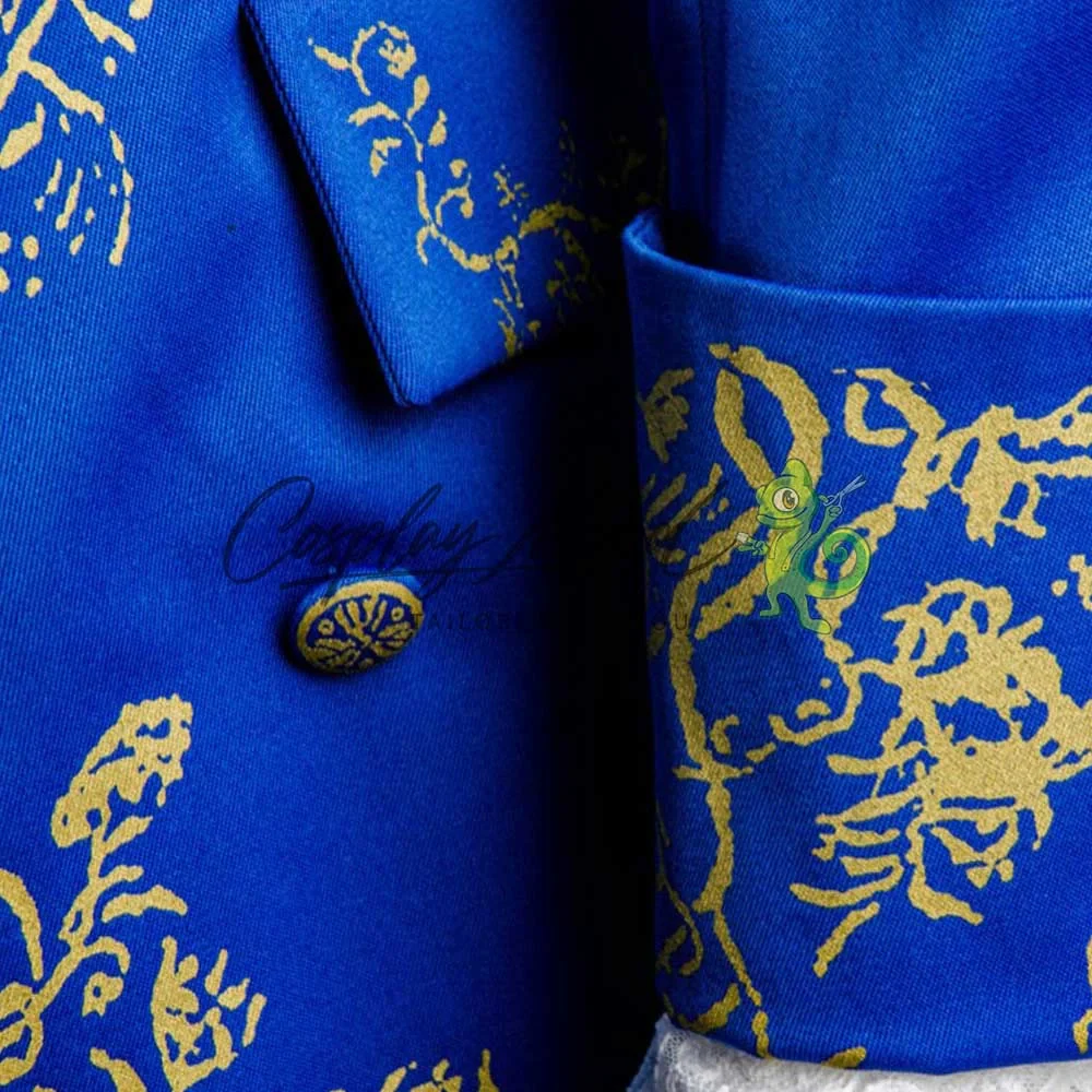 Da una camicia con ampie maniche nella zona polsi, drappo sul colletto, gilet decorato, lunga giacca blu con decori e pantaloni.