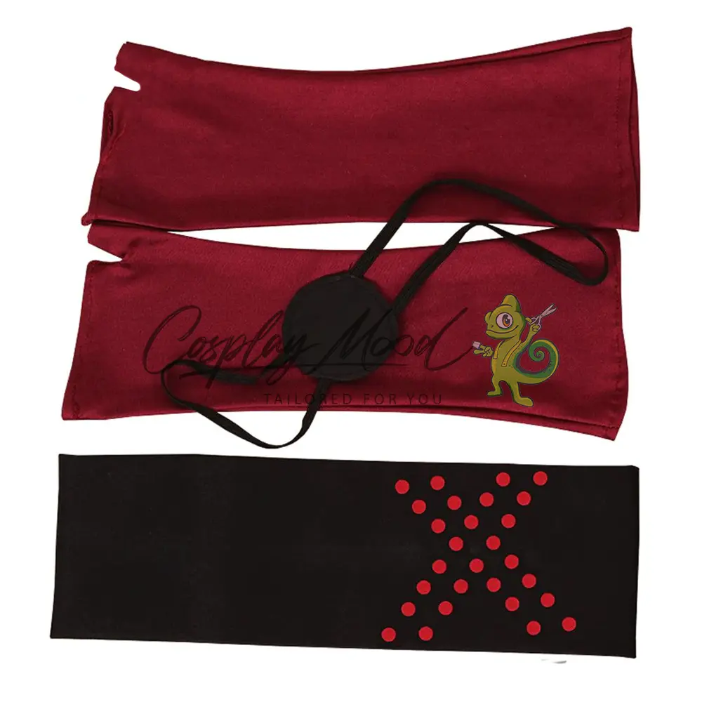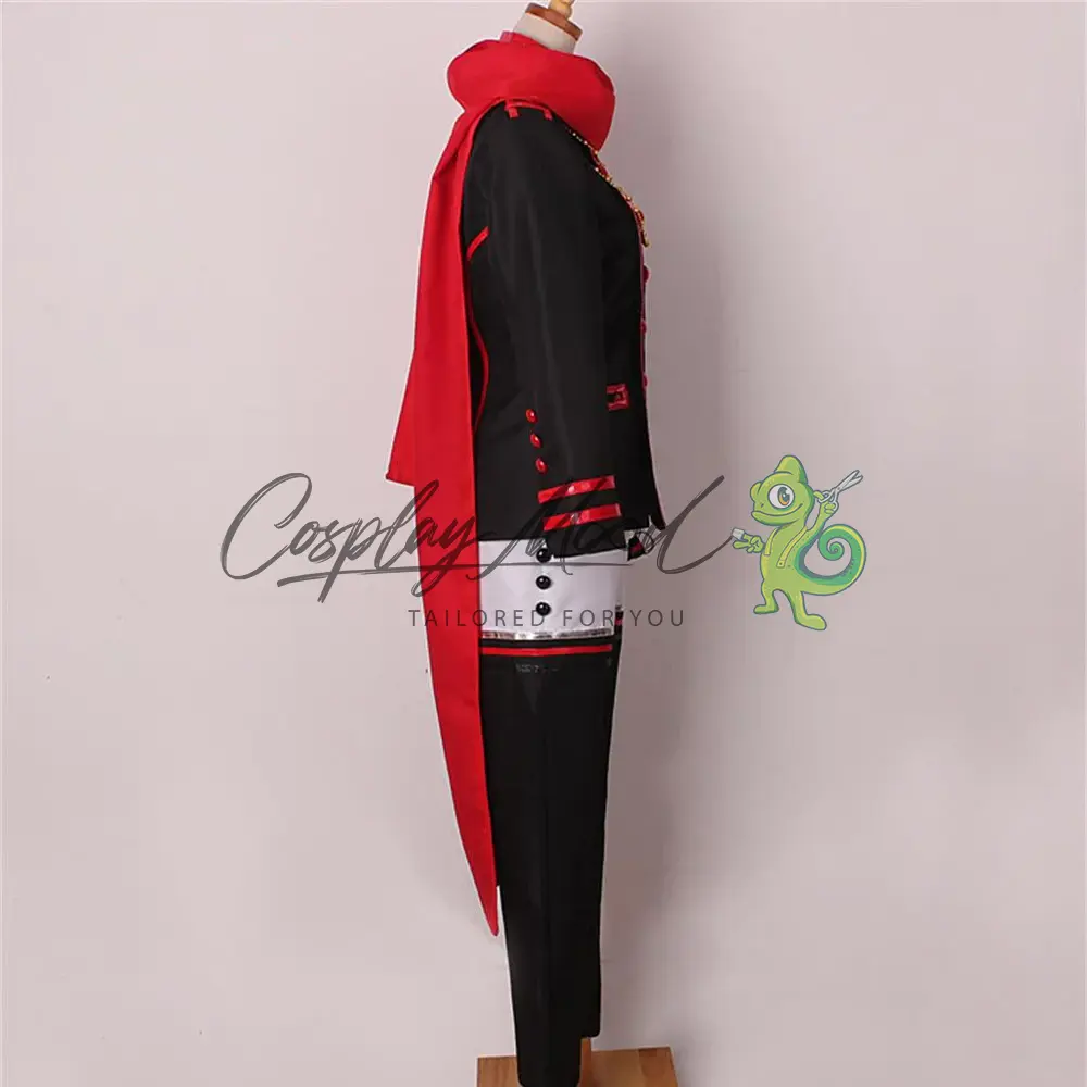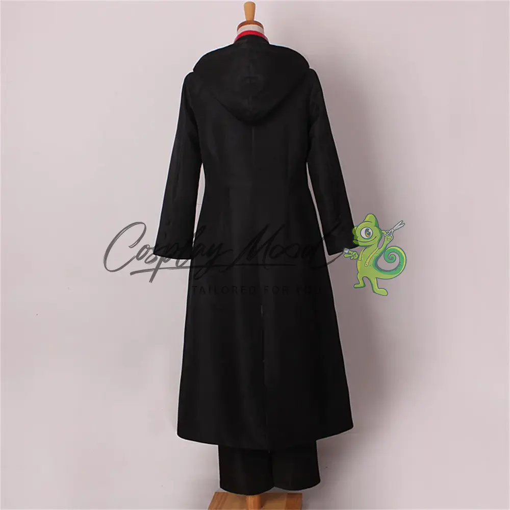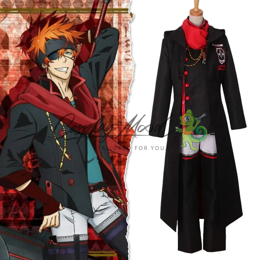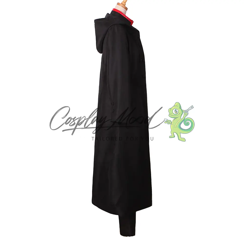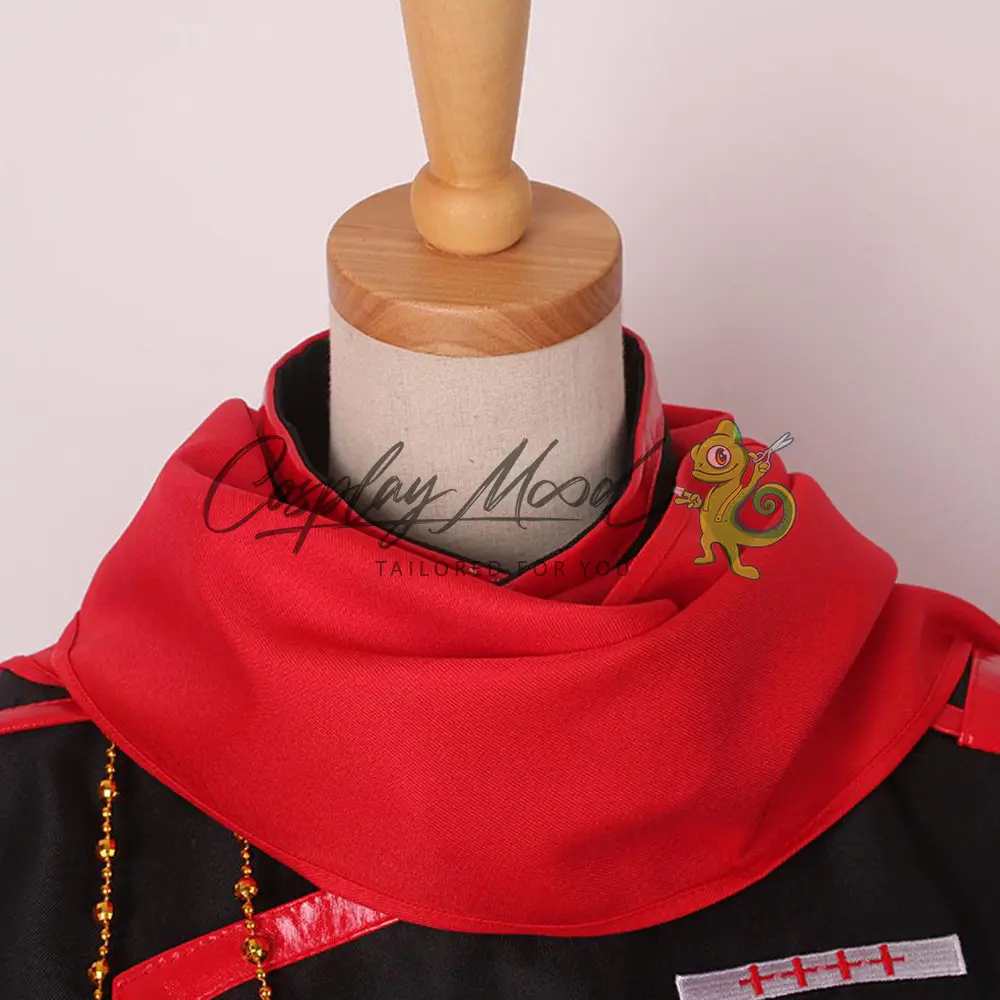 Cappotto lungo nero con cappuccio e stemma sul petto, sciarpa rossa, giacca nera con bottoni e bordi rossi, catenella dorata, fascia, guanti rossi, benda per l’occhio, pantaloni bianchi con decorazioni nere e rosse.
