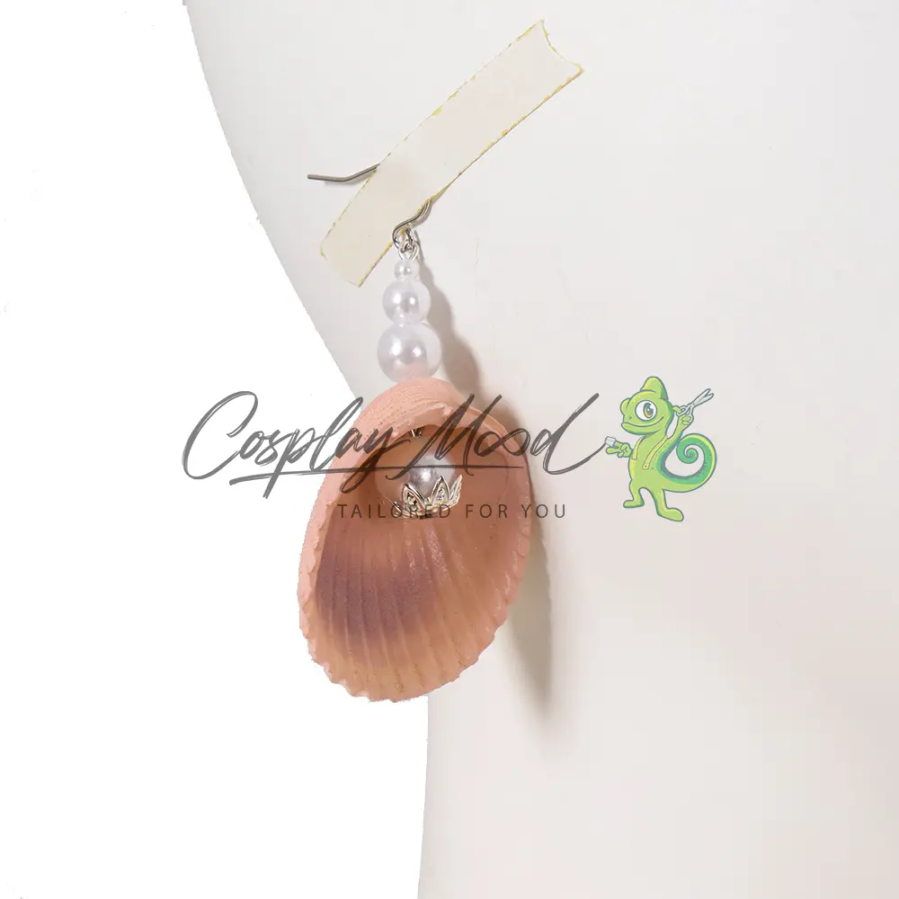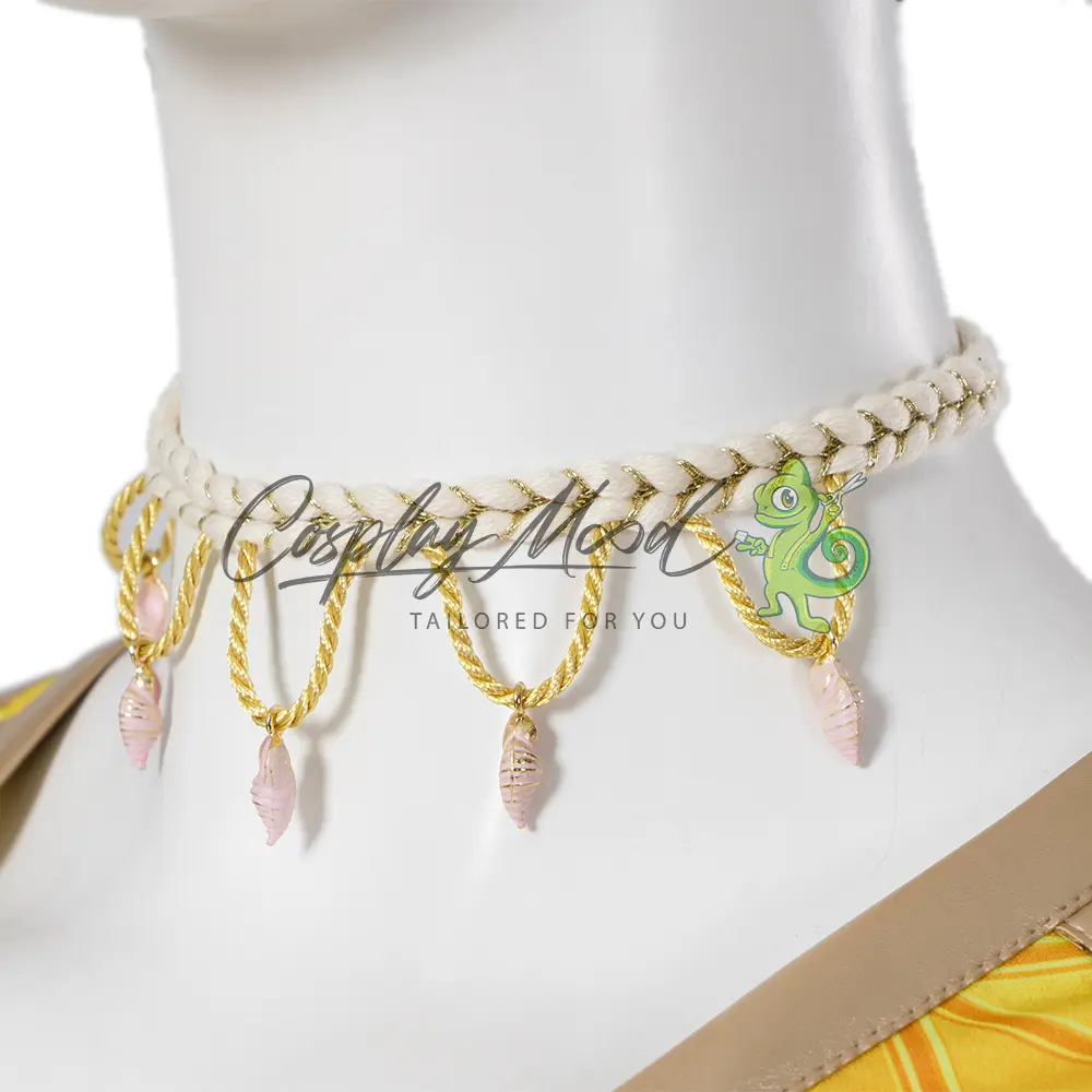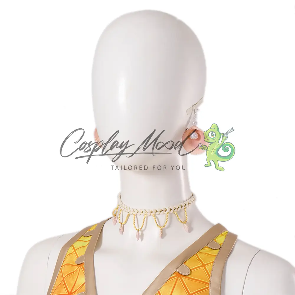 Orecchini a forma di conchiglia, collana con pendenti, top arancione con decorazioni dorate in rilievo, set di bracciali con pietre, cintura bianca con fibbia dorata, pantaloncini con texture, borselli per le gambe, cinturini bianchi per i polpacci, guanti, pareo con decorazioni floreali e scarpe dorate con pietra azzurra.