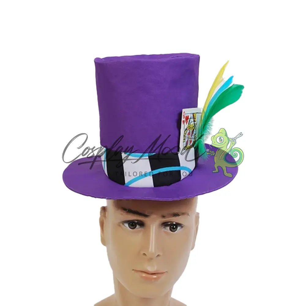Collarino nero, cappello, veste viola con decorazioni dorate e bottoni, coppia di cinture e borsello laterale.