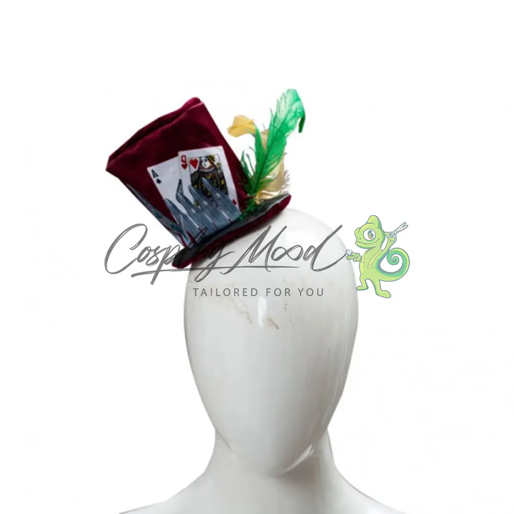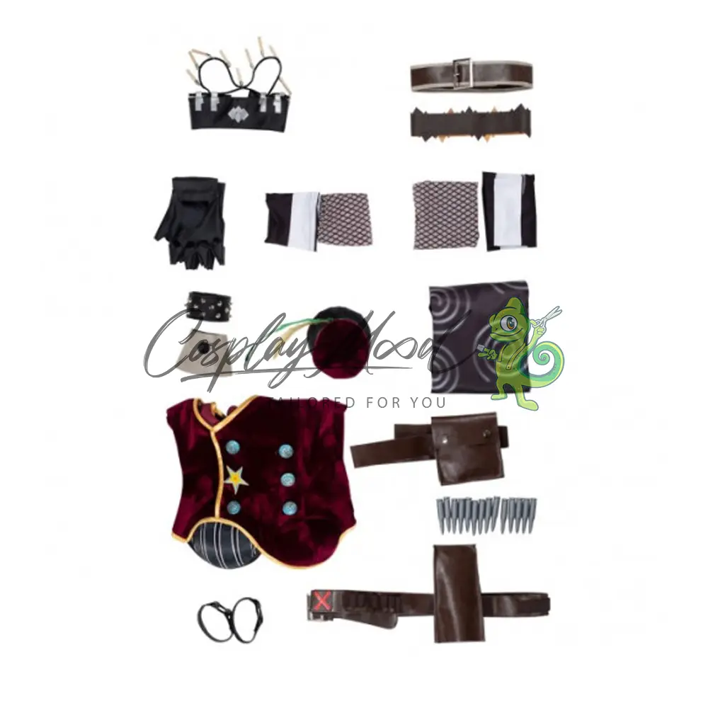 Collarino nero con decorazioni, cappello, manicotto nero e bianco, manicotto con rete, coppia di guanti neri senza dita, polsino, bracciale borchiato, cinturini neri, cintura marrone doppia con borsello, vestito rosso con bottoni e decorazioni, coppia di calze con le stesse texture dei manicotti, cinturino per la gamba.