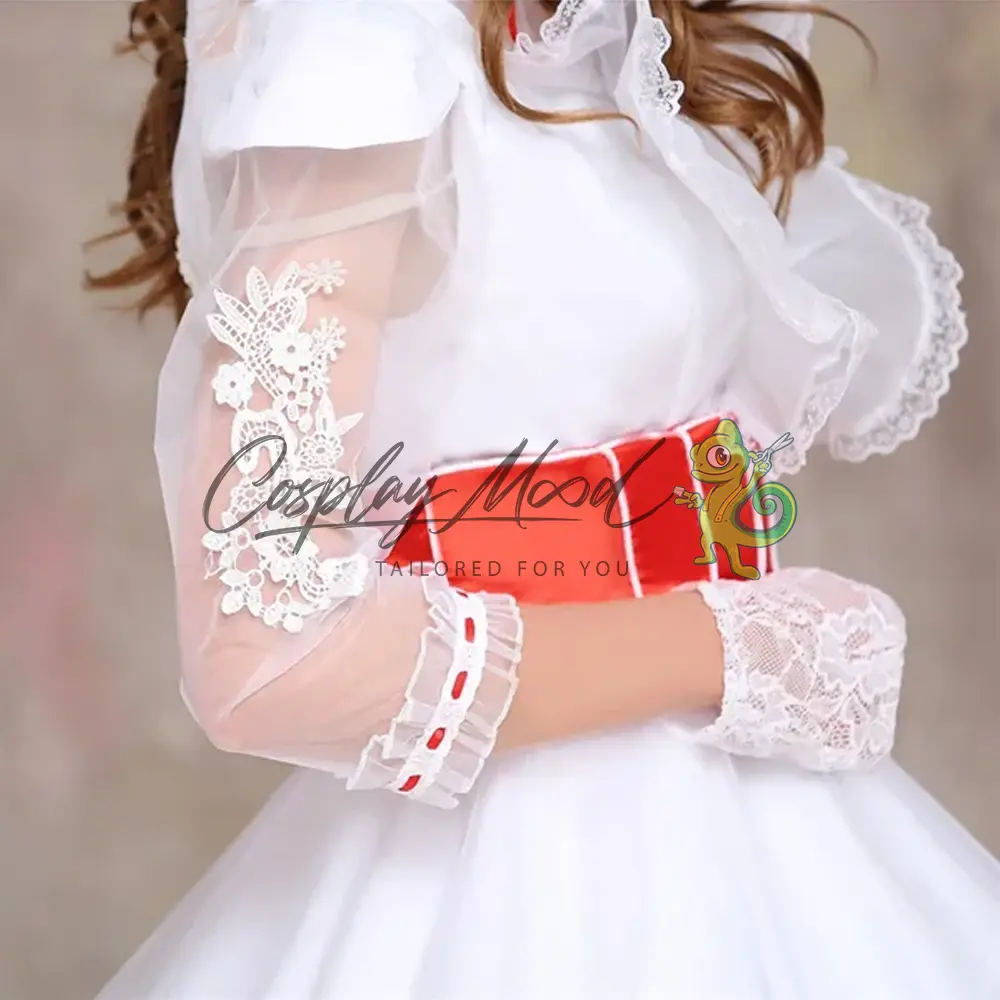 Vestito bianco corto con spalline, fascia rossa in vita, decorazioni a fiocco rosse lungo la gonna, sottogonna, maniche trasparenti con fiori in rilievo, guanti e cappello.