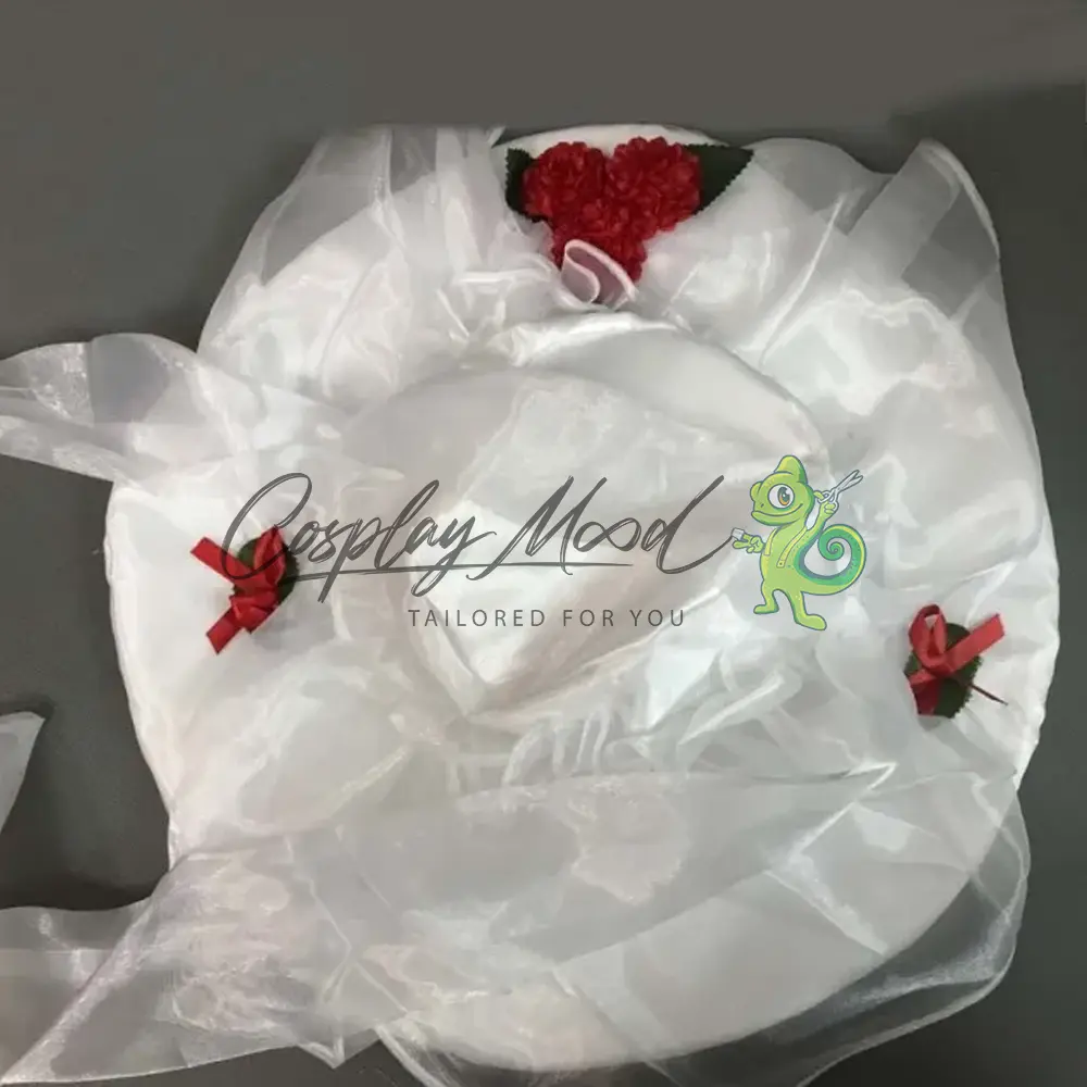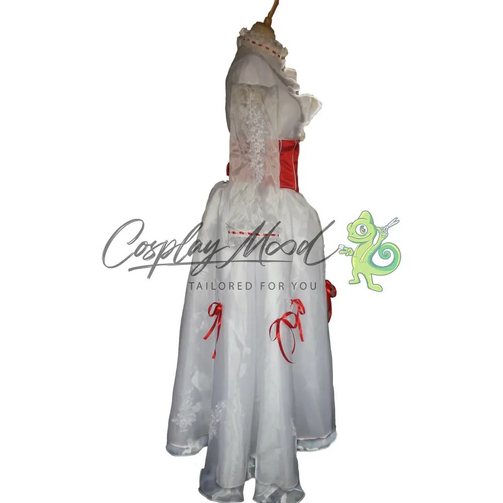 Vestito bianco lungo con fiocco al collo, maniche trasparenti con motivi floreali, fascia rossa in vita, decorazioni a fiocco rosse lungo la gonna e cappello con finiture rosse e verdi.