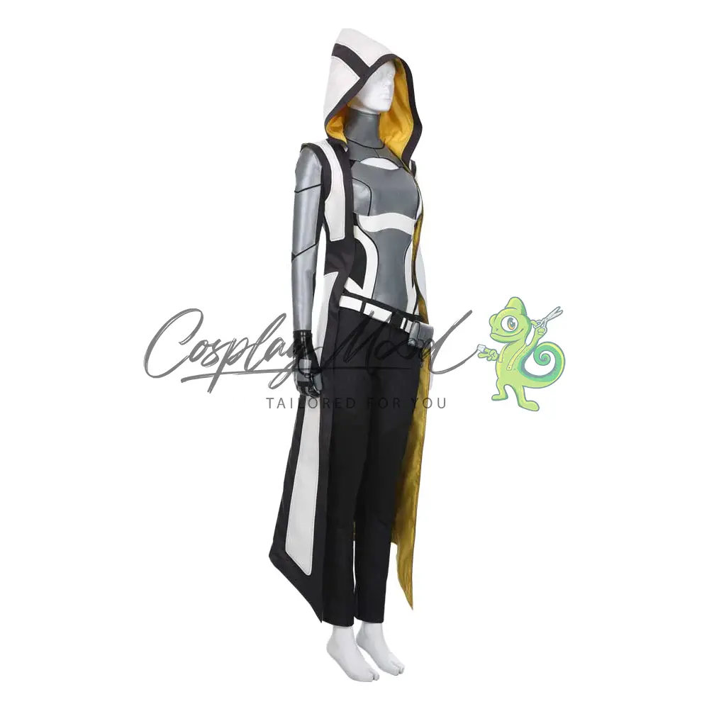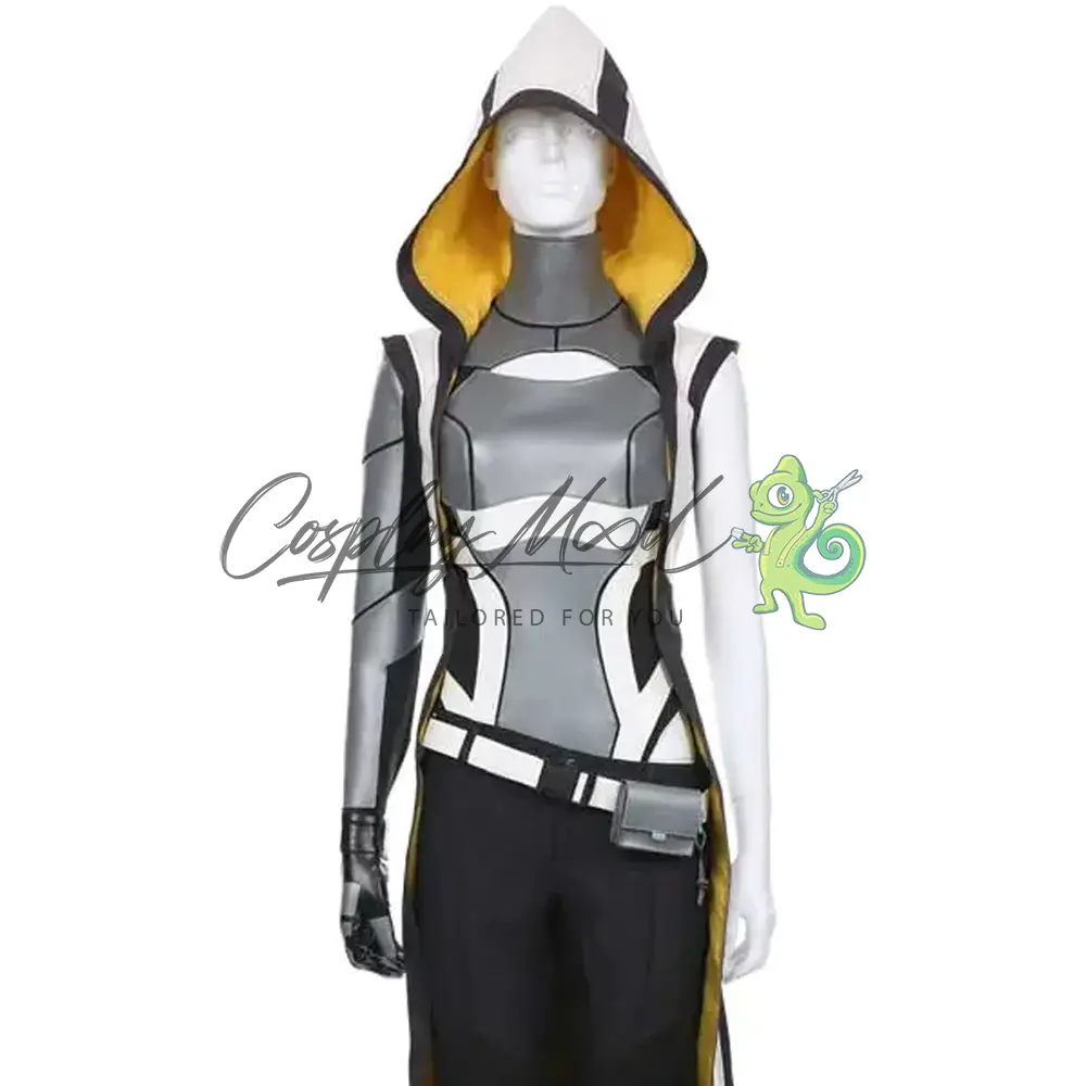 Giacca lunga smanicata di colore bianco e nero con fodera interna gialla e cappuccio, pantaloni neri, cintura con borsello, body e guanto.