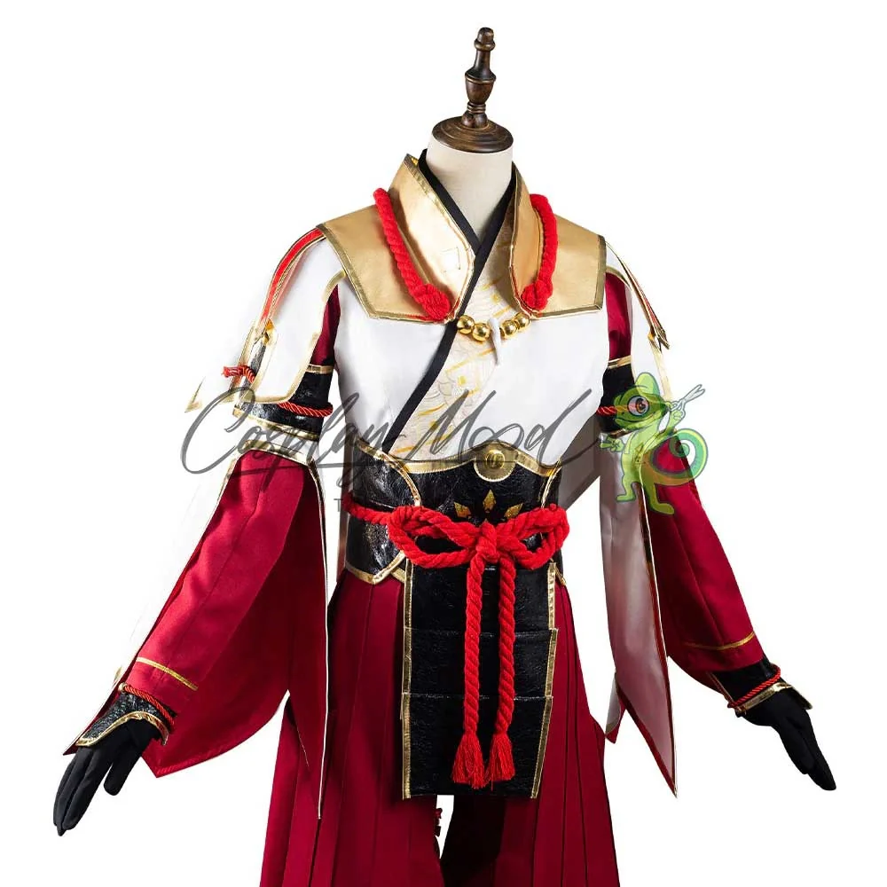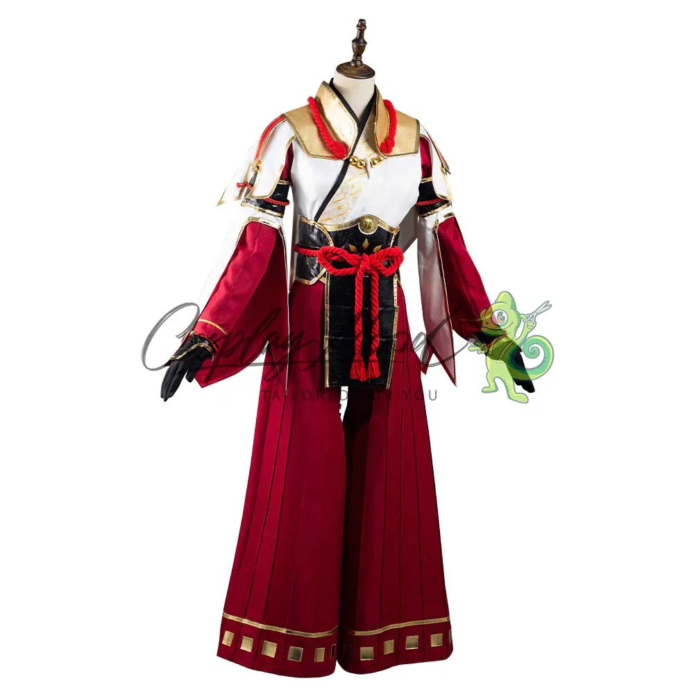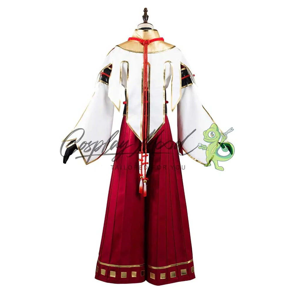 Un kimono rosso e bianco con una falda centrale fissata con un nodo cerimoniale rosso, collana, para braccia, paramenti come da foto e pantaloni hakama.