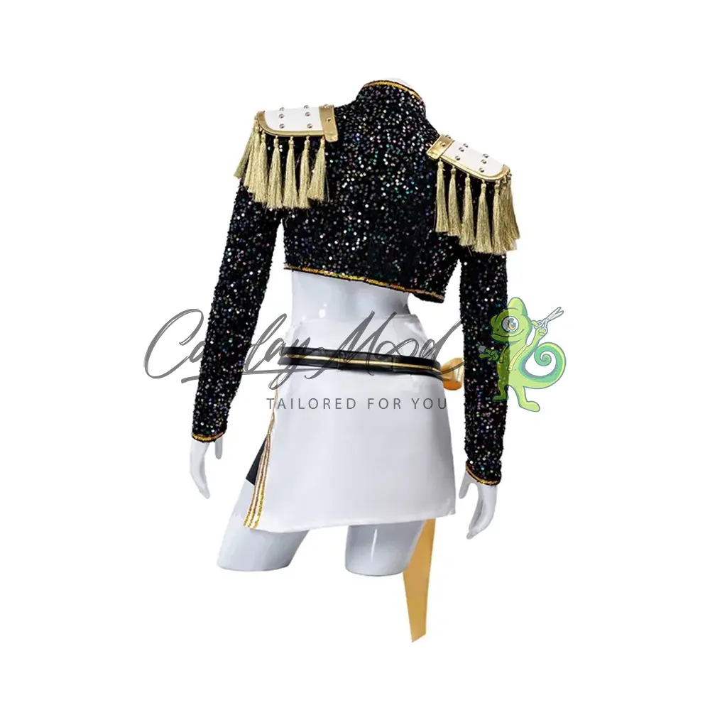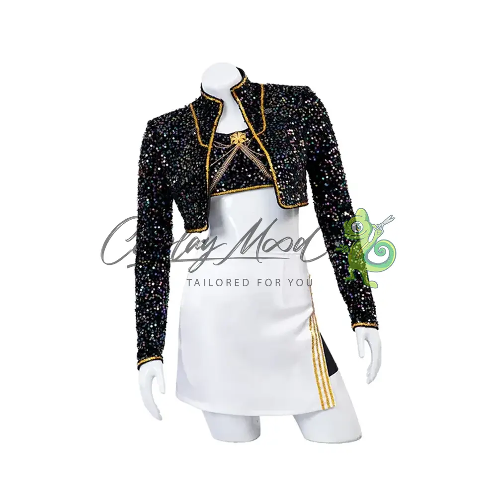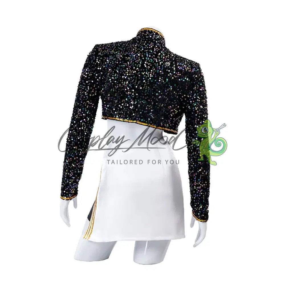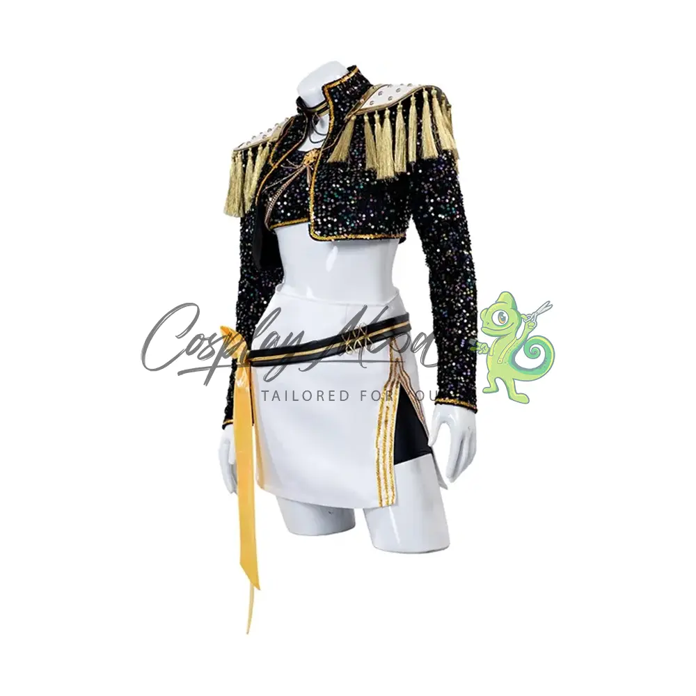 Giacca nera con spalline dorate, top nero con stessa trama della giacca, gonna bianca con cintura e nastro dorato, pantaloncini corti neri e scarpe incluse.