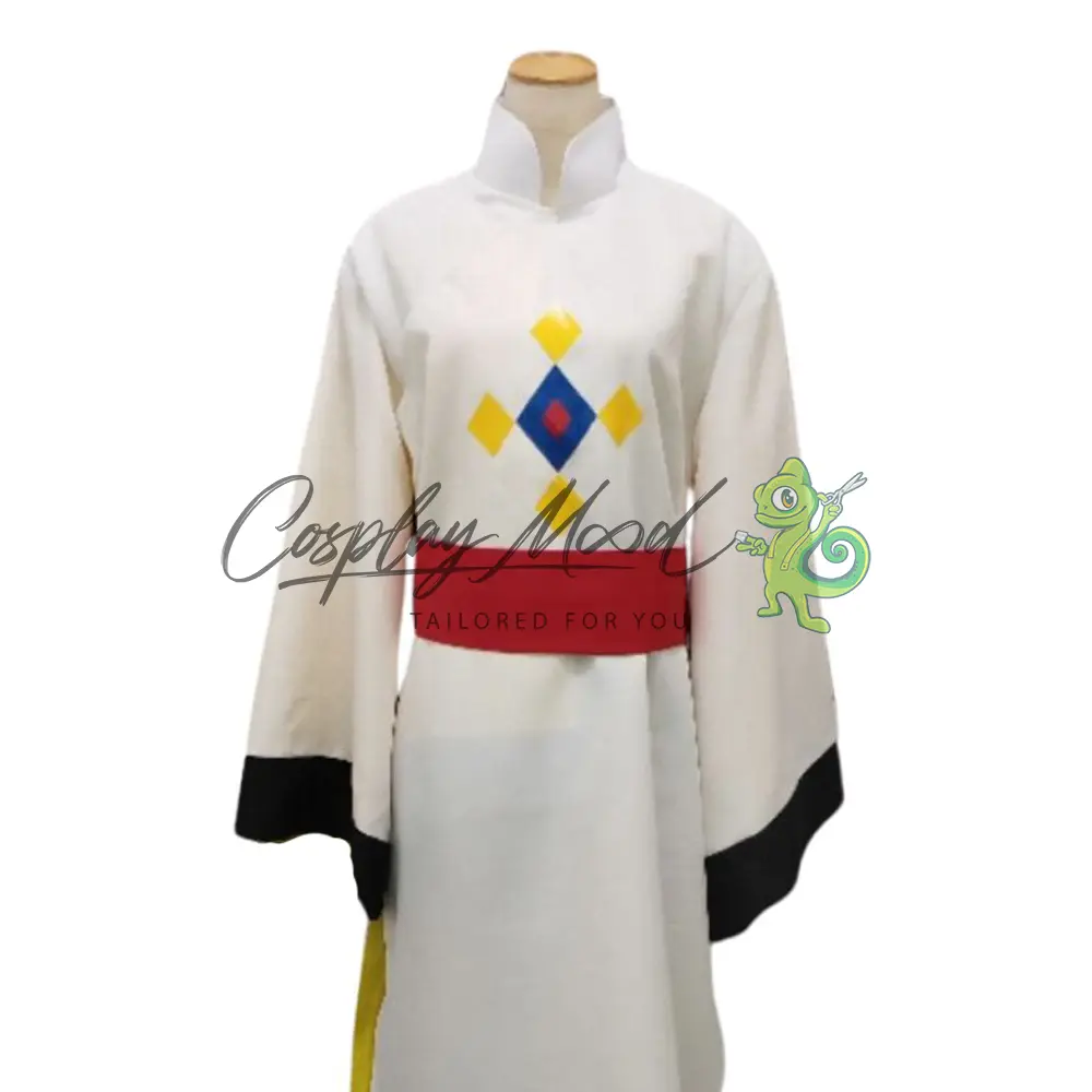 Tunica lunga bianca con colletto alzato, maniche nere e decorazioni frontali color blu, rosso e giallo, gli interni invece sono foderati in giallo, fascia rossa da mettere in vita, pantaloni lunghi scuri.