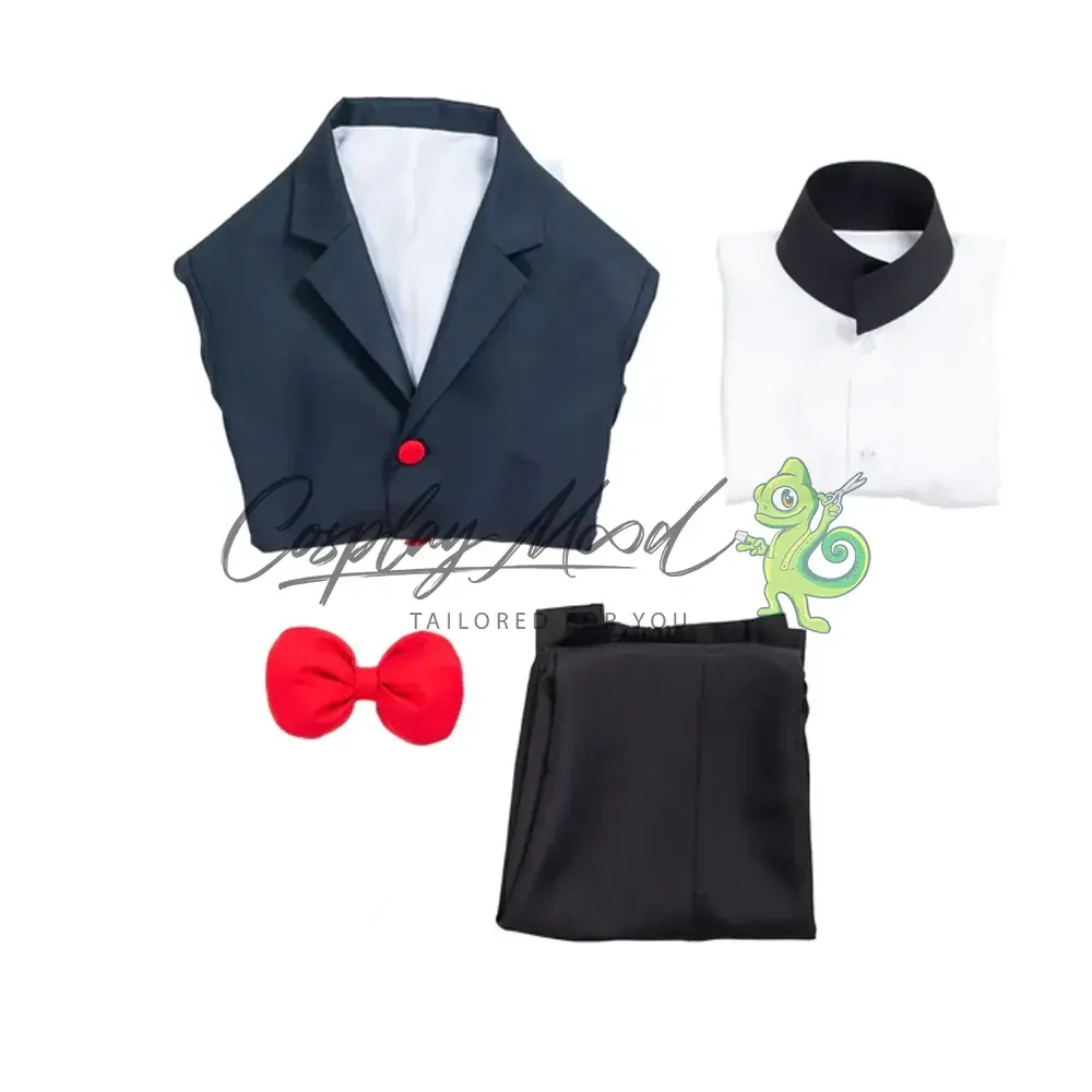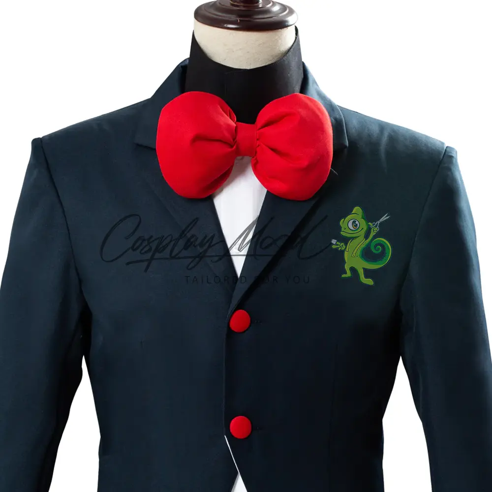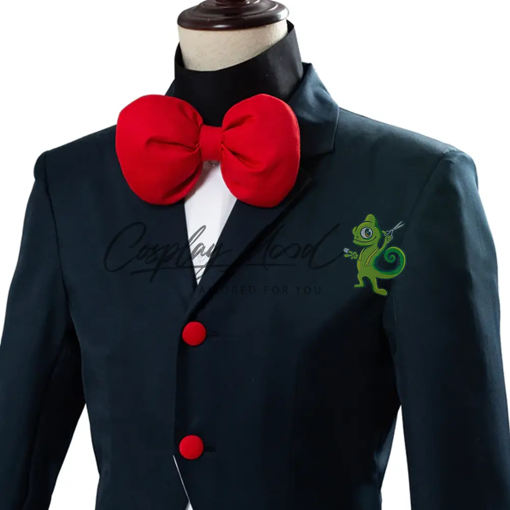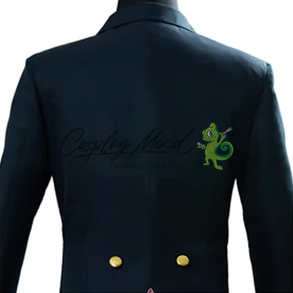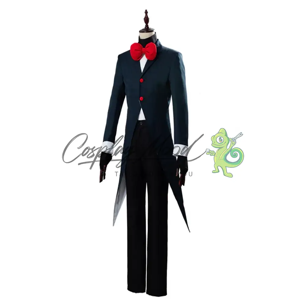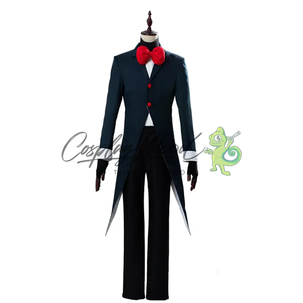 Giacca lunga scura con colletto dello stesso colore, bottoni rossi, maniche e fodera interna di colore bianco, maglia bianca con colletto alto nero, pantaloni neri e papillon rosso.