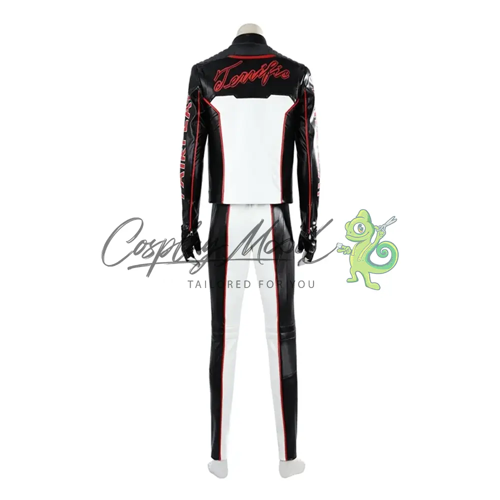 Giacca nera e bianca con scritta posteriore, tuta integrale sempre bianca e nera, cintura in coordinato, guanti e scarpe.